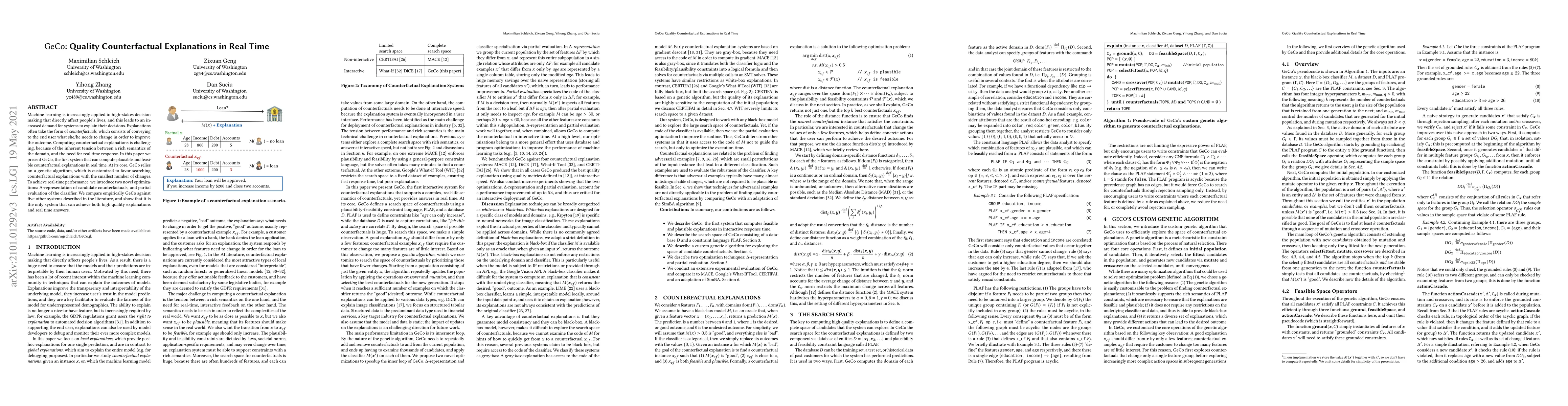 Machine learning is increasingly applied in high-stakes decision making that directly affect people's lives, and this leads to an increased demand for systems to explain their decisions. Explanations often take the form of counterfactuals, which consists of conveying to the end user what she/he needs to change in order to improve the outcome. Computing counterfactual explanations is challenging, because of the inherent tension between a rich semantics of the domain, and the need for real time response. In this paper we present GeCo, the first system that can compute plausible and feasible counterfactual explanations in real time. At its core, GeCo relies on a genetic algorithm, which is customized to favor searching counterfactual explanations with the smallest number of changes. To achieve real-time performance, we introduce two novel optimizations: $\Delta$-representation of candidate counterfactuals, and partial evaluation of the classifier. We compare empirically GeCo against five other systems described in the literature, and show that it is the only system that can achieve both high quality explanations and real time answers.