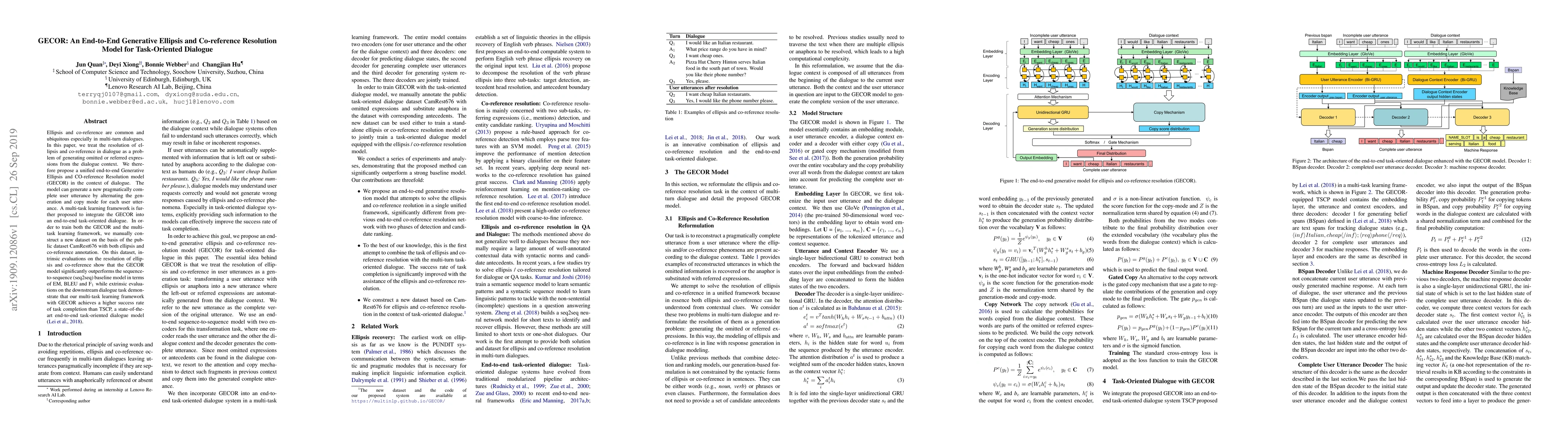 The paper introduces GECOR, a generative model for resolving ellipsis and co-reference in task-oriented dialogue. GECOR combines generation and copy modes to produce complete utterances and integrates into a multi-task learning framework for end-to-end dialogue. The model outperforms baselines in intrinsic evaluations and enhances task completion rates in downstream tasks.