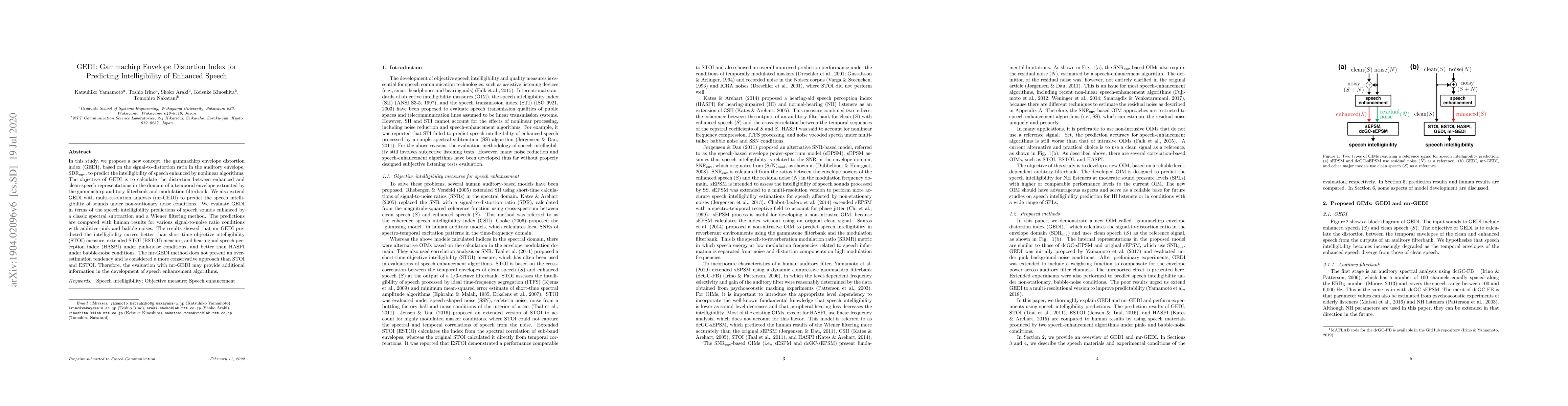 The paper proposes the Gammachirp Envelope Distortion Index (GEDI) to predict the intelligibility of enhanced speech, based on the signal-to-distortion ratio in the auditory envelope. An extended version, mr-GEDI, incorporates multi-resolution analysis to better predict intelligibility under non-stationary noise conditions, outperforming existing measures like STOI, ESTOI, and HASPI.