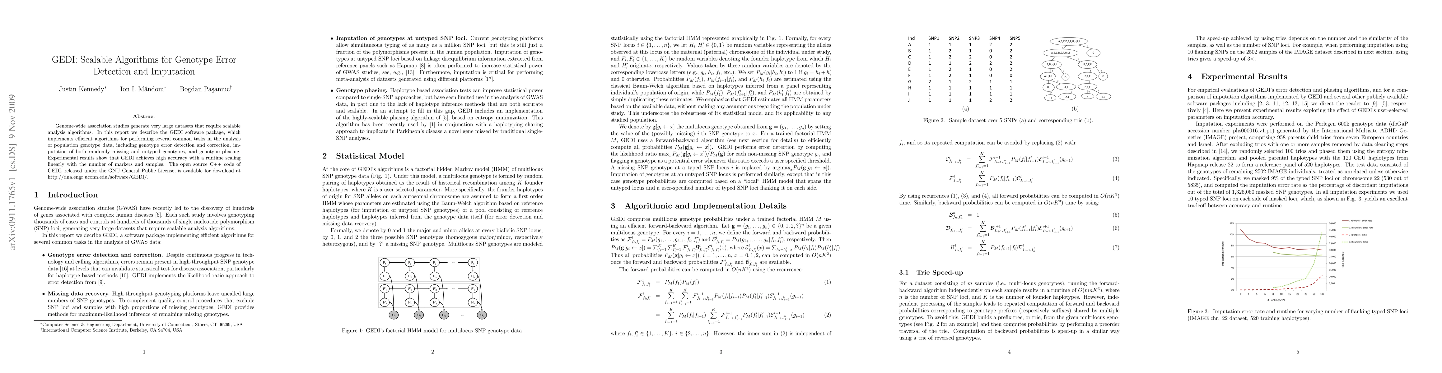 The GEDI software package is introduced for scalable analysis of large genotype datasets in genome-wide association studies. It efficiently performs genotype error detection, correction, imputation, and phasing with linear runtime scaling. The open-source C++ code is available for download.