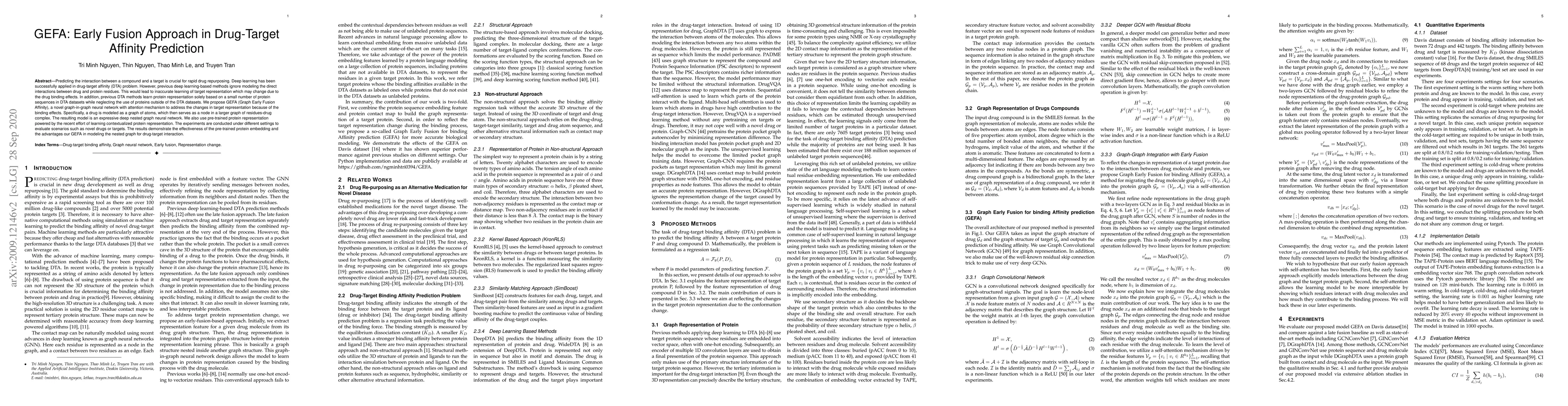 GEFA is a novel graph-in-graph neural network with attention to predict drug-target affinity, addressing the binding effects on target representation. It uses pre-trained protein embeddings and nested graph modeling to improve accuracy, showing effectiveness in scenarios involving novel drugs or targets.