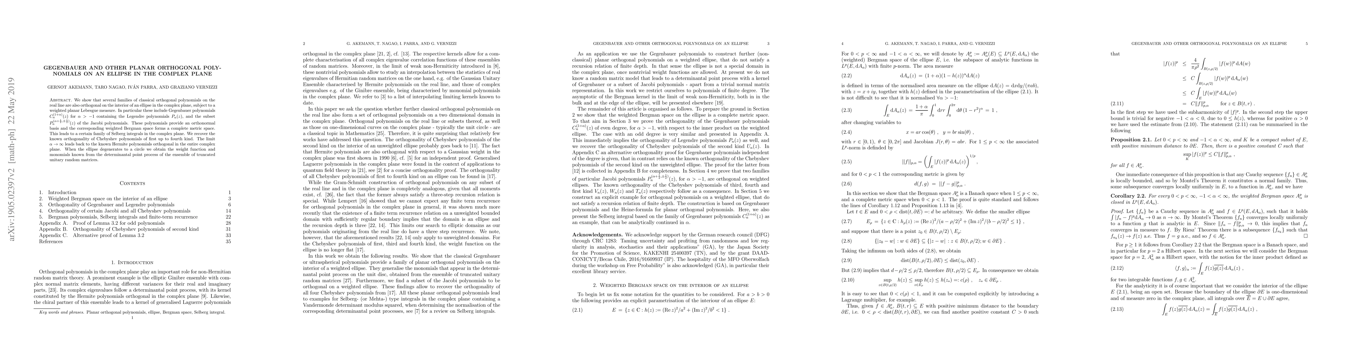 We show that several families of classical orthogonal polynomials on the real line are also orthogonal on the interior of an ellipse in the complex plane, subject to a weighted planar Lebesgue measure. In particular these include Gegenbauer polynomials $C_n^{(1+\alpha)}(z)$ for $\alpha>-1$ containing the Legendre polynomials $P_n(z)$, and the subset $P_n^{(\alpha+\frac12,\pm\frac12)}(z)$ of the Jacobi polynomials. These polynomials provide an orthonormal basis and the corresponding weighted Bergman space forms a complete metric space. This leads to a certain family of Selberg integrals in the complex plane. We recover the known orthogonality of Chebyshev polynomials of first up to fourth kind. The limit $\alpha\to\infty$ leads back to the known Hermite polynomials orthogonal in the entire complex plane. When the ellipse degenerates to a circle we obtain the weight function and monomials known from the determinantal point process of the ensemble of truncated unitary random matrices.