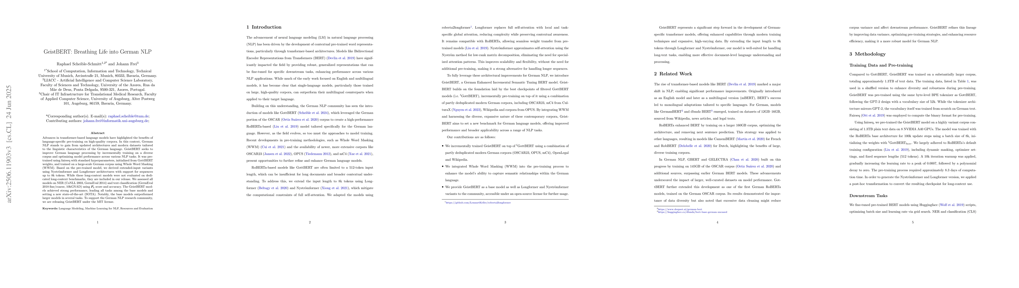 GeistBERT is a transformer-based language model for German NLP, pre-trained on a large-scale German corpus and fine-tuned for various tasks. It outperforms existing models, setting a new state-of-the-art in named entity recognition and text classification tasks, with extended-input variants supporting sequences up to 8k tokens.