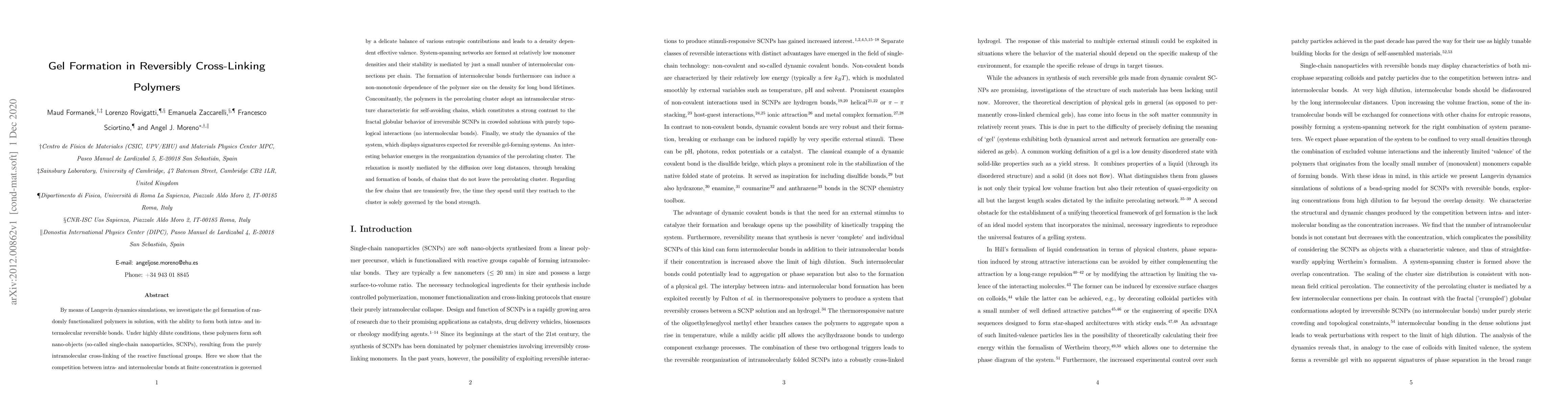 By means of Langevin dynamics simulations, we investigate the gel formation of randomly functionalized polymers in solution, with the ability to form both intra- and intermolecular reversible bonds. Under highly dilute conditions, these polymers form soft nano-objects (so-called single-chain nanoparticles, SCNPs), resulting from the purely intramolecular cross-linking of the reactive functional groups. Here we show that the competition between intra- and intermolecular bonds at finite concentration is governed by a delicate balance of various entropic contributions and leads to a density dependent effective valence. System-spanning networks are formed at relatively low monomer densities and their stability is mediated by just a small number of intermolecular connections per chain. The formation of intermolecular bonds furthermore can induce a non-monotonic dependence of the polymer size on the density for long bond lifetimes. Concomitantly, the polymers in the percolating cluster adopt an intramolecular structure characteristic for self-avoiding chains, which constitutes a strong contrast to the fractal globular behavior of irreversible SCNPs in crowded solutions with purely topological interactions (no intermolecular bonds). Finally, we study the dynamics of the system, which displays signatures expected for reversible gel-forming systems. An interesting behavior emerges in the reorganization dynamics of the percolating cluster. The relaxation is mostly mediated by the diffusion over long distances, through breaking and formation of bonds, of chains that do not leave the percolating cluster. Regarding the few chains that are transiently free, the time they spend until they reattach to the cluster is solely governed by the bond strength.