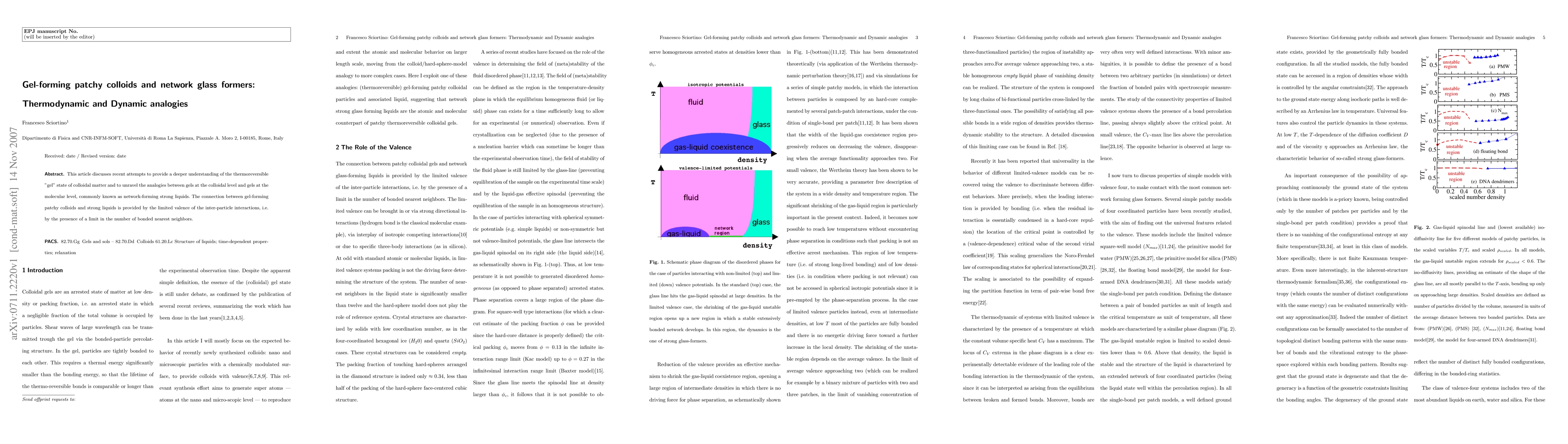 This paper explores the thermodynamic and dynamic similarities between gel-forming patchy colloids and network-forming strong liquids, emphasizing the role of limited valence in inter-particle interactions in creating these analogies. The study aims to deepen the understanding of the thermoreversible "gel" state in colloidal matter.
