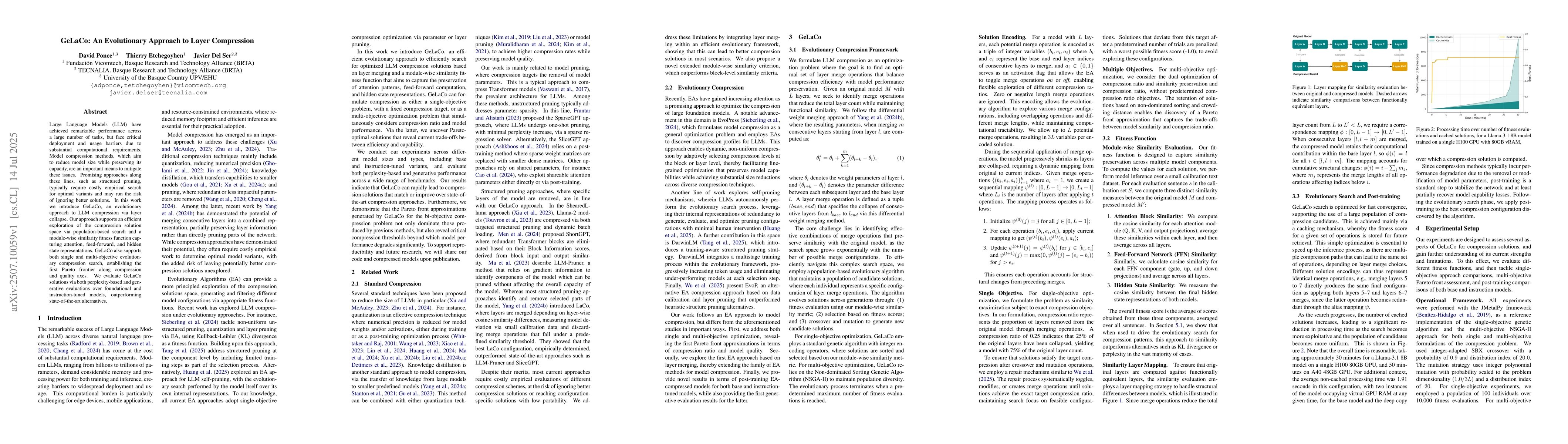Large Language Models (LLM) have achieved remarkable performance across a large number of tasks, but face critical deployment and usage barriers due to substantial computational requirements. Model compression methods, which aim to reduce model size while preserving its capacity, are an important means to mitigate these issues. Promising approaches along these lines, such as structured pruning, typically require costly empirical search for optimal variants and may run the risk of ignoring better solutions. In this work we introduce GeLaCo, an evolutionary approach to LLM compression via layer collapse. Our approach supports an efficient exploration of the compression solution space via population-based search and a module-wise similarity fitness function capturing attention, feed-forward, and hidden state representations. GeLaCo also supports both single and multi-objective evolutionary compression search, establishing the first Pareto frontier along compression and quality axes. We evaluate GeLaCo solutions via both perplexity-based and generative evaluations over foundational and instruction-tuned models, outperforming state-of-the-art alternatives.