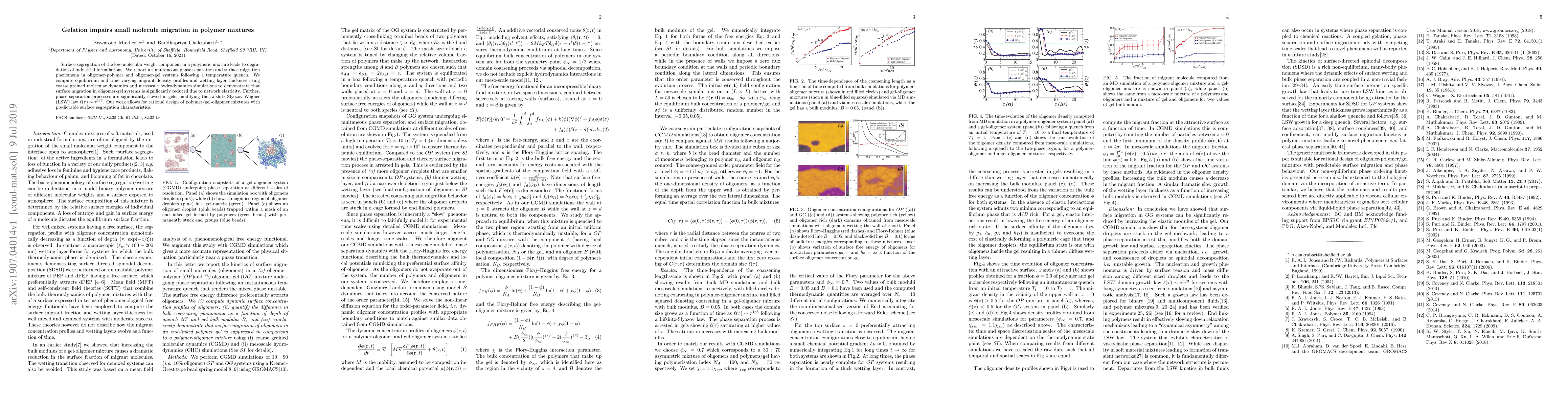 Surface segregation of the low-molecular weight component in a polymeric mixture leads to degradation of industrial formulations. We report a simultaneous phase separation and surface migration phenomena in oligomer-polymer and oligomer-gel systems following a temperature quench. We compute equilibrium and time varying migrant density profiles and wetting layer thickness using coarse grained molecular dynamics and mesoscale hydrodynamics simulations to demonstrate that surface migration in oligomer-gel systems is significantly reduced due to network elasticity. Further, phase separation processes are significantly slowed in gels, modifying the Lifshitz-Slyozov-Wagner (LSW) law $\ell(\tau) \sim \tau^{1/3}$. Our work allows for rational design of polymer/gel-oligomer mixtures with predictable surface segregation characteristics.
