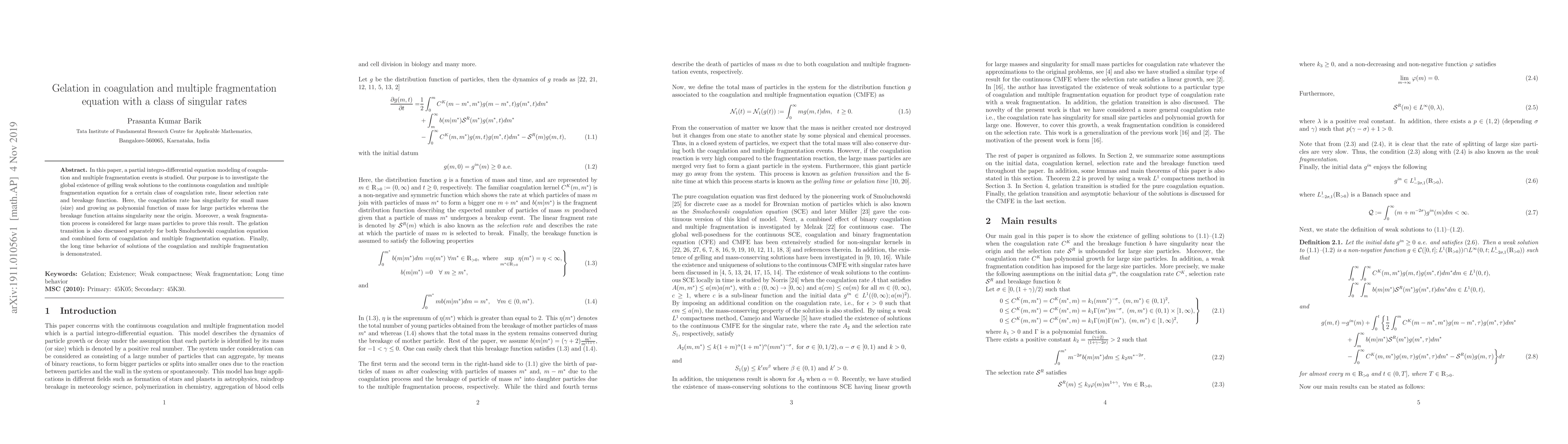 This paper studies a partial integro-differential equation modeling coagulation and multiple fragmentation, focusing on the global existence of gelling weak solutions for a class of singular rates. It discusses the gelation transition and long-time behavior of solutions, considering singular coagulation and fragmentation processes.