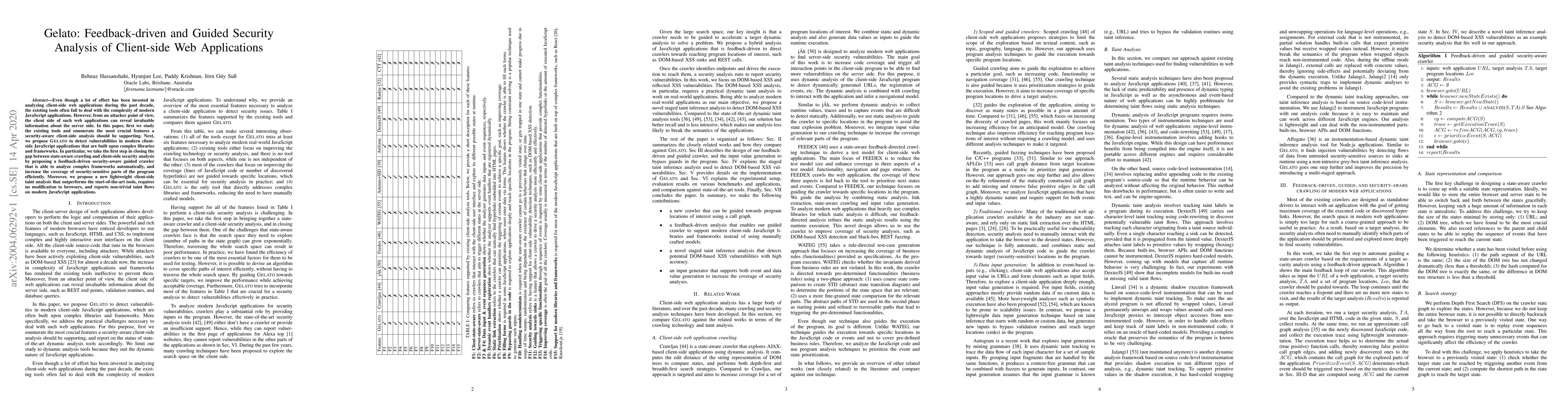 This paper critiques existing tools for analyzing client-side web applications and proposes GELATO, a feedback-driven and guided security analysis tool for modern JavaScript applications. It introduces a state-aware crawler and a lightweight taint analysis to improve vulnerability detection and coverage.