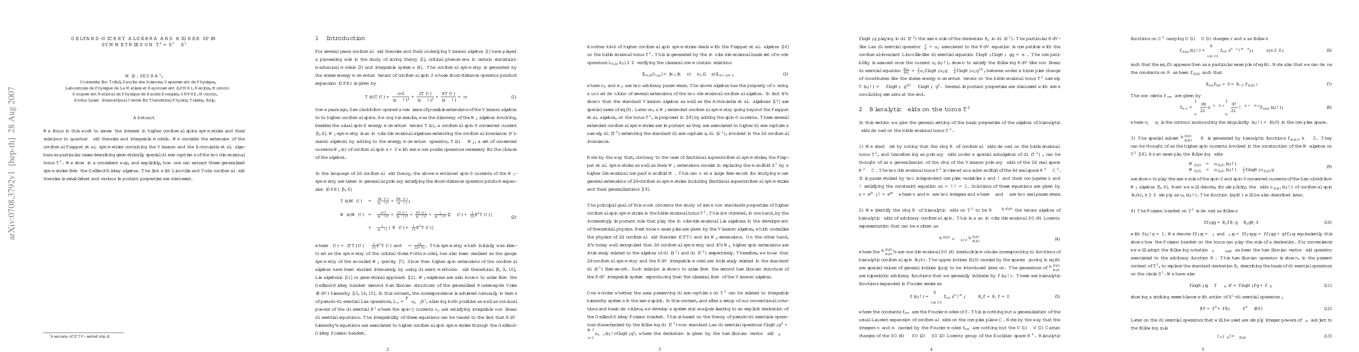 We focus in this work to renew the interest in higher conformal spins symmetries and their relations to quantum field theories and integrable models. We consider the extension of the conformal Frappat et al. symmetries containing the Virasoro and the Antoniadis et al. algebras as particular cases describing geometrically special diffeomorphisms of the two dimensional torus $T^2$. We show in a consistent way, and explicitly, how one can extract these generalized symmetries from the Gelfand-Dickey algebra. The link with Liouville and Toda conformal field theories is established and various important properties are discussed.