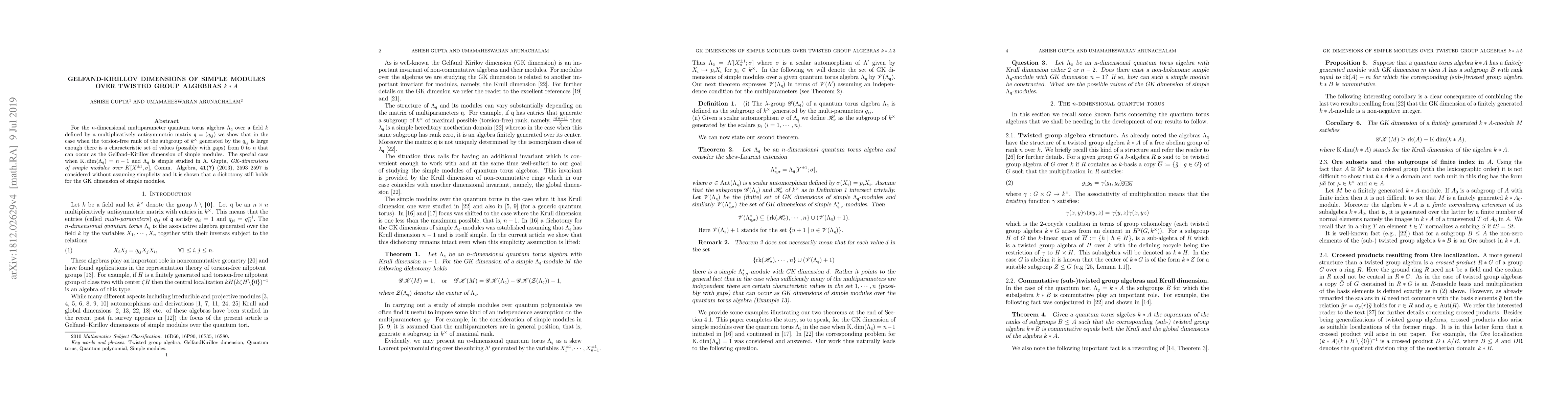 This paper investigates the Gelfand-Kirillov dimensions of simple modules over twisted group algebras $k \ast A$, specifically for the $n$-dimensional multiparameter quantum torus algebra $\Lambda_{\mathfrak q}$. It demonstrates that when the torsion-free rank of the subgroup generated by the $q_{ij}$ is sufficiently large, simple modules can have dimensions ranging from $0$ to $n$.