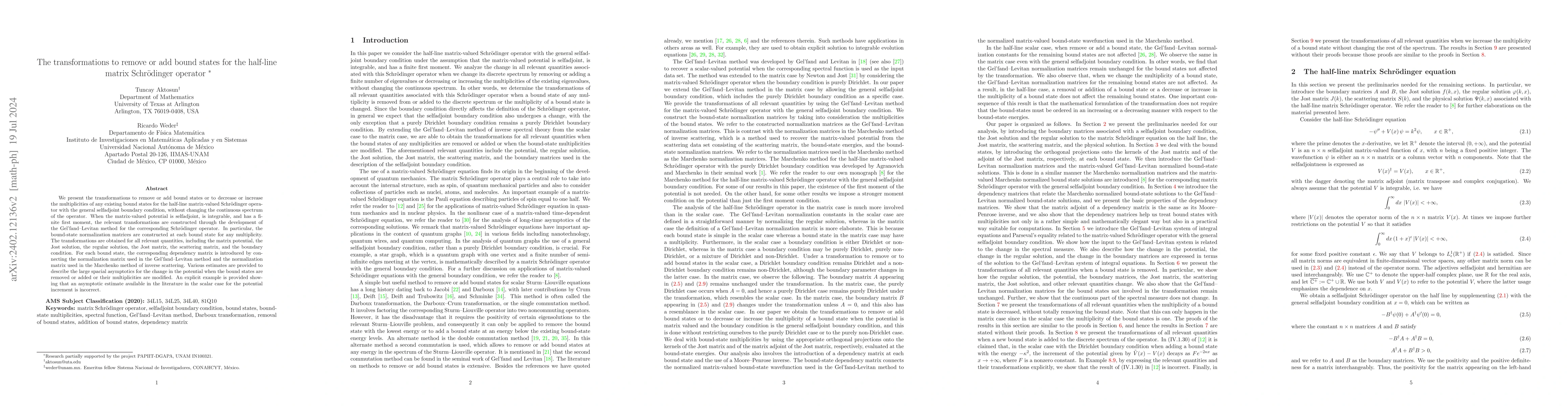 We develop transformations to remove and to add bound states, and to decrease or increase the multiplicity of a bound state,for the half-line matrix Schr\"odinger equation with the general selfadjoint boundary condition. We use the Gel'fand-Levitan method. When a bound state is added or removed from the spectrum, and when the multiplicity of a bound state is decreased or increased, it is shown how the following quantities transform: the regular and the Jost solutions, the potential, the boundary matrices, the Jost matrix, the scattering matrix, and other relevant quantities. The Gel'fand-Levitan normalization matrices are defined for the bound states by taking into consideration the multiplicities of the bound states.