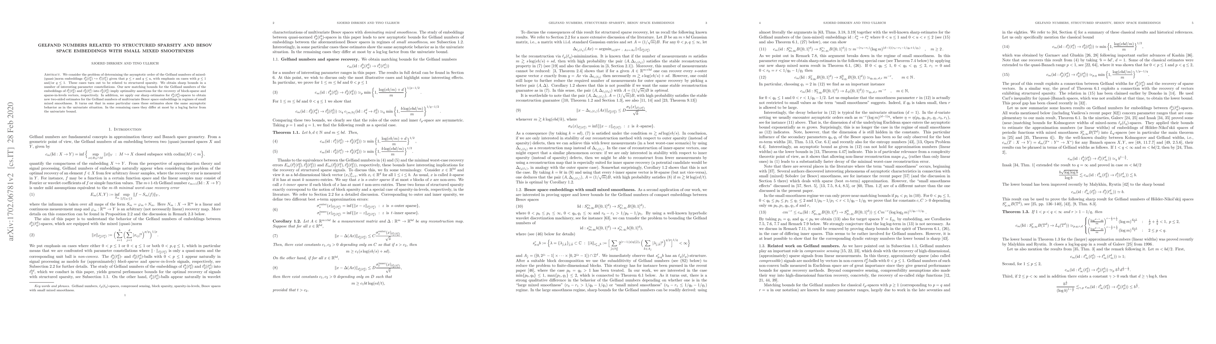 This paper determines the asymptotic order of Gelfand numbers for mixed-(quasi-)norm embeddings, focusing on structured sparsity cases with $p\leq 1$ and $q\leq 1$. The study provides sharp bounds for embeddings involving $\ell_1^b(\ell_2^d)$ and $\ell_2^b(\ell_1^d)$ into $\ell_2^b(\ell_2^d)$, implying optimality for sparse vector recovery, and extends these results to multivariate Besov spaces with small mixed smoothness.