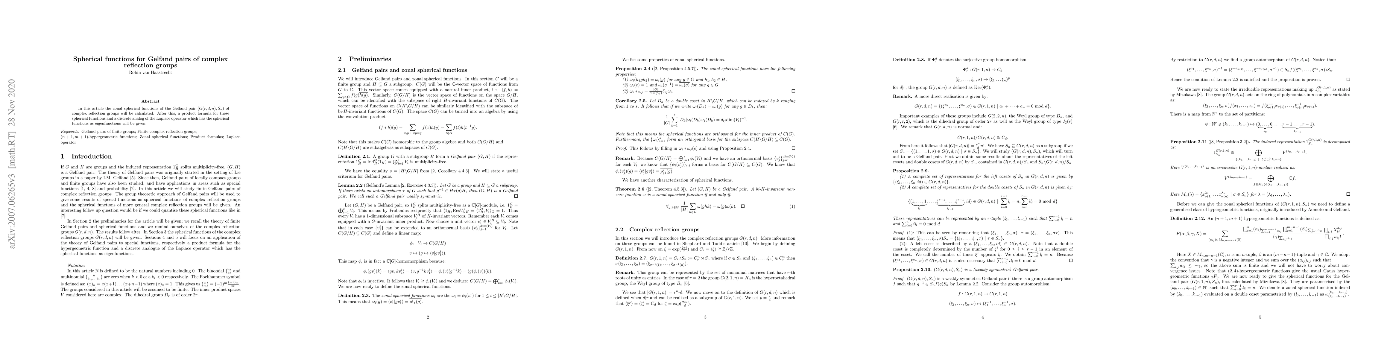 In this article the zonal spherical functions of the Gelfand pair $(G(r,d,n), S_n)$ of complex reflection groups will be calculated. After this, a product formula for these spherical functions and a discrete analog of the Laplace operator which has the spherical functions as eigenfunctions will be given.