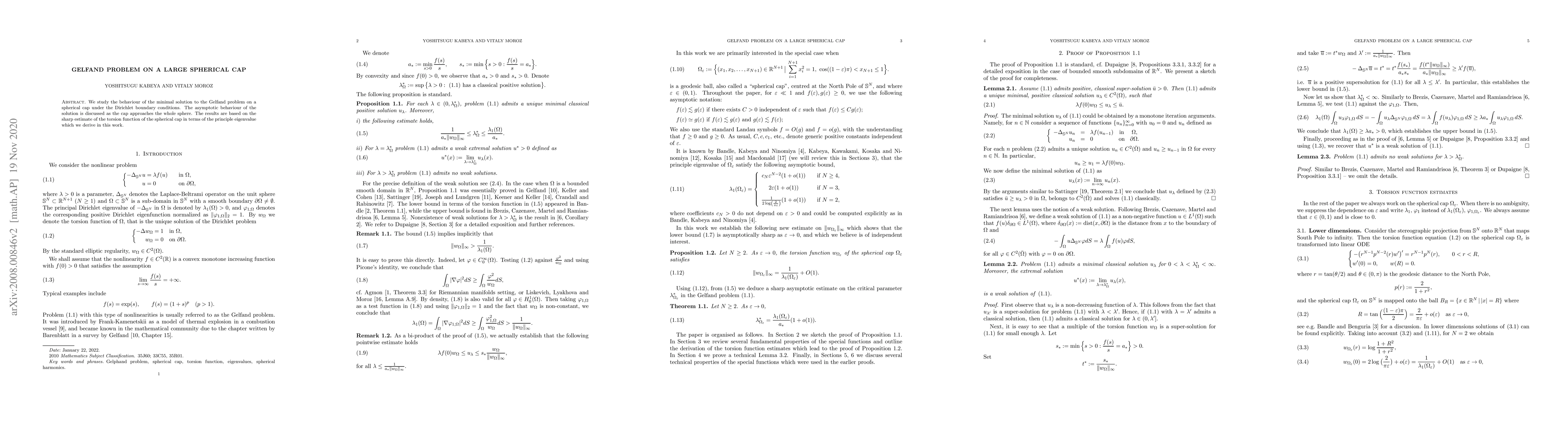 We study the behaviour of the minimal solution to the Gelfand problem on a spherical cap under the Dirichlet boundary conditions. The asymptotic behaviour of the solution is discussed as the cap approaches the whole sphere. The results are based on the sharp estimate of the torsion function of the spherical cap in terms of the principle eigenvalue which we derive in this work.