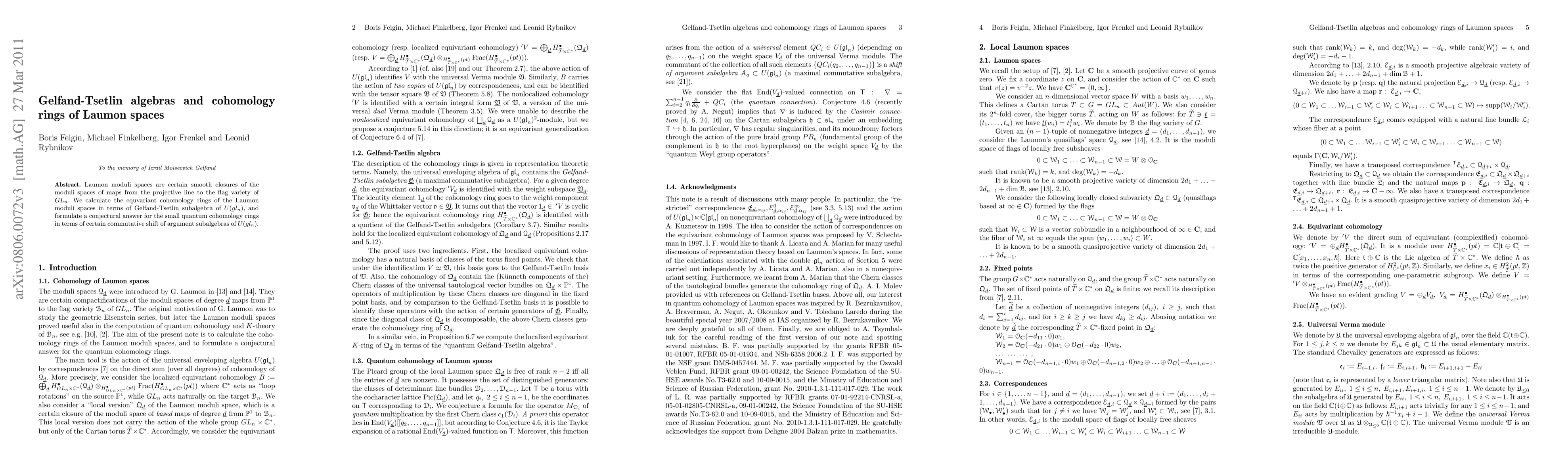 This paper calculates the equivariant cohomology rings of Laumon moduli spaces using Gelfand-Tsetlin subalgebras of U(gl_n), and proposes a conjecture for the small quantum cohomology rings based on commutative shift of argument subalgebras of U(gl_n).
