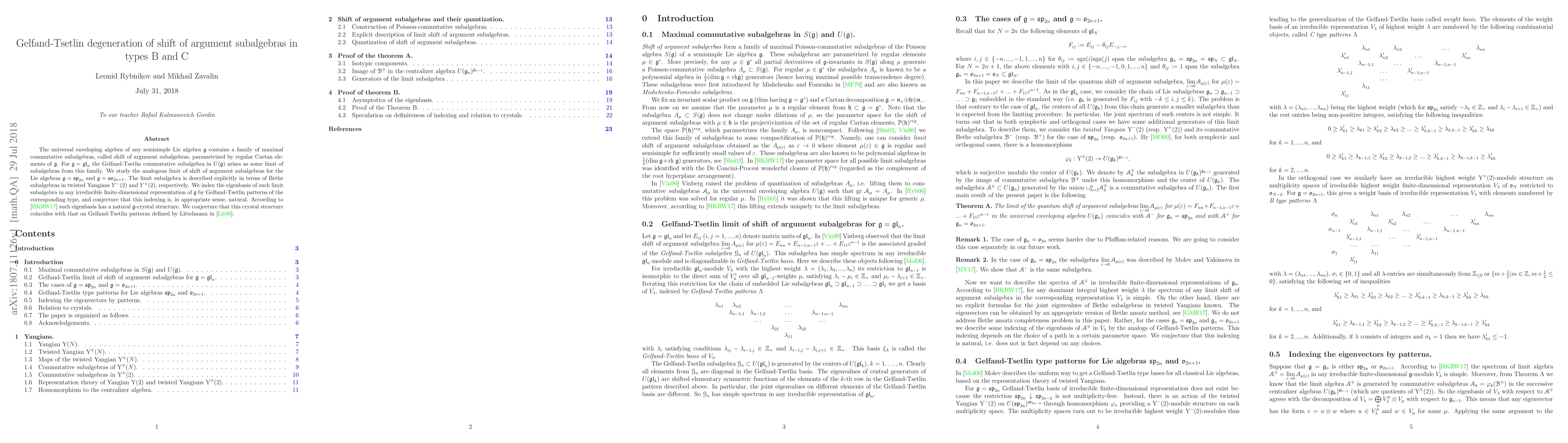 The universal enveloping algebra of any semisimple Lie algebra $\mathfrak{g}$ contains a family of maximal commutative subalgebras, called shift of argument subalgebras, parametrized by regular Cartan elements of $\mathfrak{g}$. For $\mathfrak{g}=\mathfrak{gl}_n$ the Gelfand-Tsetlin commutative subalgebra in $U(\mathfrak{g})$ arises as some limit of subalgebras from this family. We study the analogous limit of shift of argument subalgebras for the Lie algebras $\mathfrak{g}=\mathfrak{sp}_{2n}$ and $\mathfrak{g}=\mathfrak{so}_{2n+1}$. The limit subalgebra is described explicitly in terms of Bethe subalgebras in twisted Yangians $Y^-(2)$ and $Y^+(2)$, respectively. We index the eigenbasis of such limit subalgebra in any irreducible finite-dimensional representation of $\mathfrak{g}$ by Gelfand-Tsetlin patterns of the corresponding type, and conjecture that this indexing is, in appropriate sense, natural. According to arXiv:1708.05105 such eigenbasis has a natural $\mathfrak{g}$-crystal structure. We conjecture that this crystal structure coincides with that on Gelfand-Tsetlin patterns defined by Littelmann in https://doi.org/10.1007/BF01236431 .