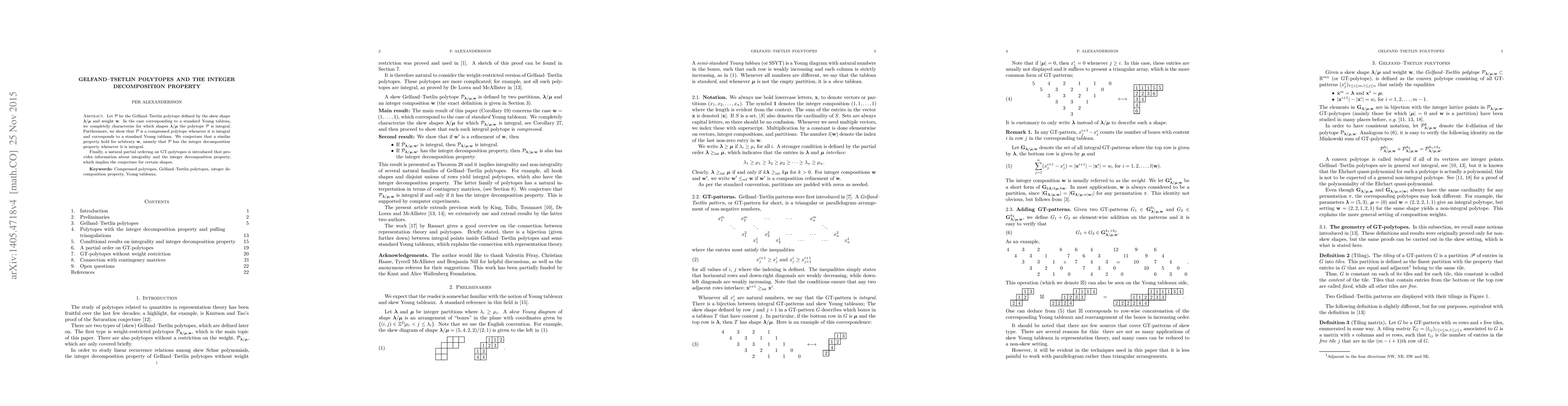 Let $P$ be the Gelfand--Tsetlin polytope defined by the skew shape $\lambda/\mu$ and weight $w$. In the case corresponding to a standard Young tableau, we completely characterize for which shapes $\lambda/\mu$ the polytope $P$ is integral. Furthermore, we show that $P$ is a compressed polytope whenever it is integral and corresponds to a standard Young tableau. We conjecture that a similar property hold for arbitrary $w$, namely that $P$ has the integer decomposition property whenever it is integral. Finally, a natural partial ordering on GT-polytopes is introduced that provides information about integrality and the integer decomposition property, which implies the conjecture for certain shapes.