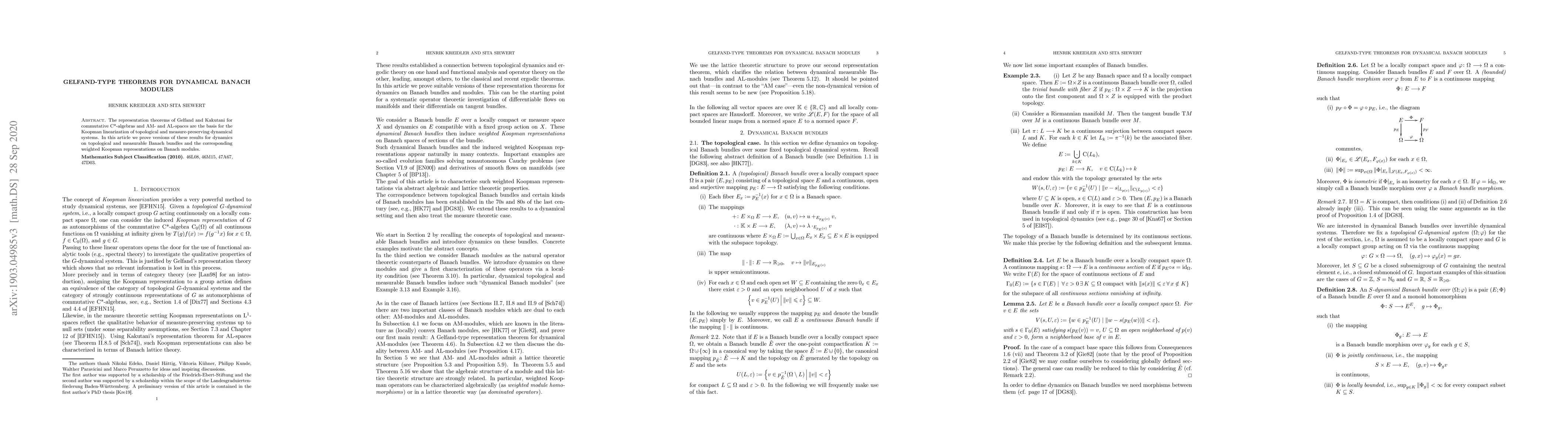 This paper proves Gelfand-type theorems for dynamical Banach modules, extending the foundational representation theorems of Gelfand and Kakutani to encompass dynamics on topological and measurable Banach bundles and their corresponding weighted Koopman representations.