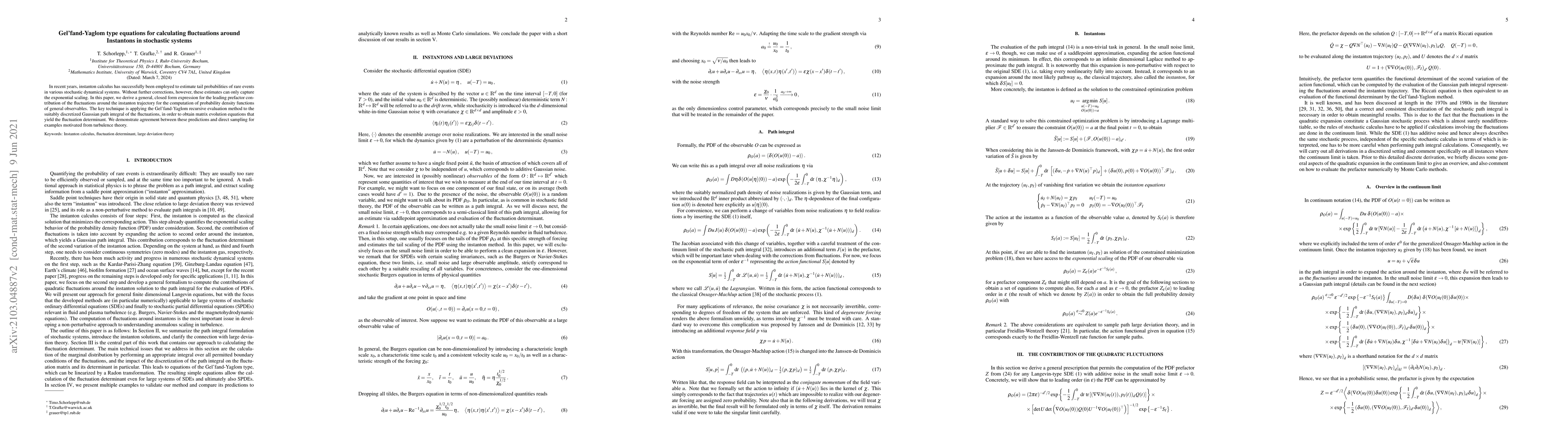 Researchers developed a method to estimate fluctuations around instantons in stochastic systems, allowing for more accurate calculations of rare event probabilities. Their approach uses Gel'fand-Yaglom recursive evaluation to derive closed-form expressions for fluctuation prefactors.