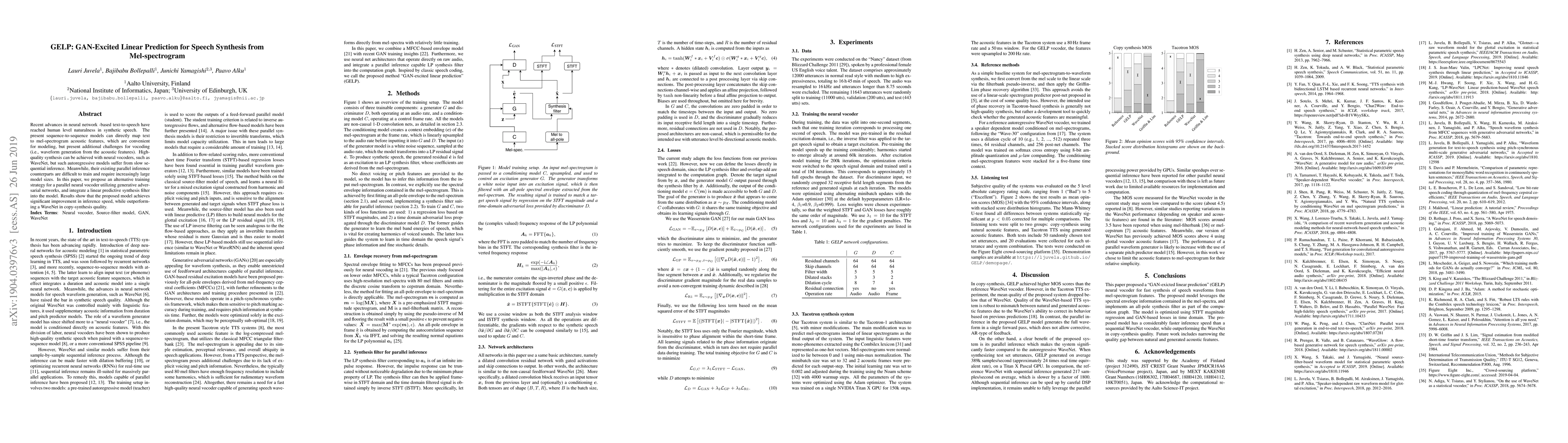 Title: GELP: GAN-Excited Linear Prediction for Speech Synthesis from Mel-spectrogram Summary: The paper proposes a novel parallel neural vocoder using GANs for faster inference and integrates linear predictive synthesis for improved speech quality, achieving better results than WaveNet in terms of speed and synthesis quality.