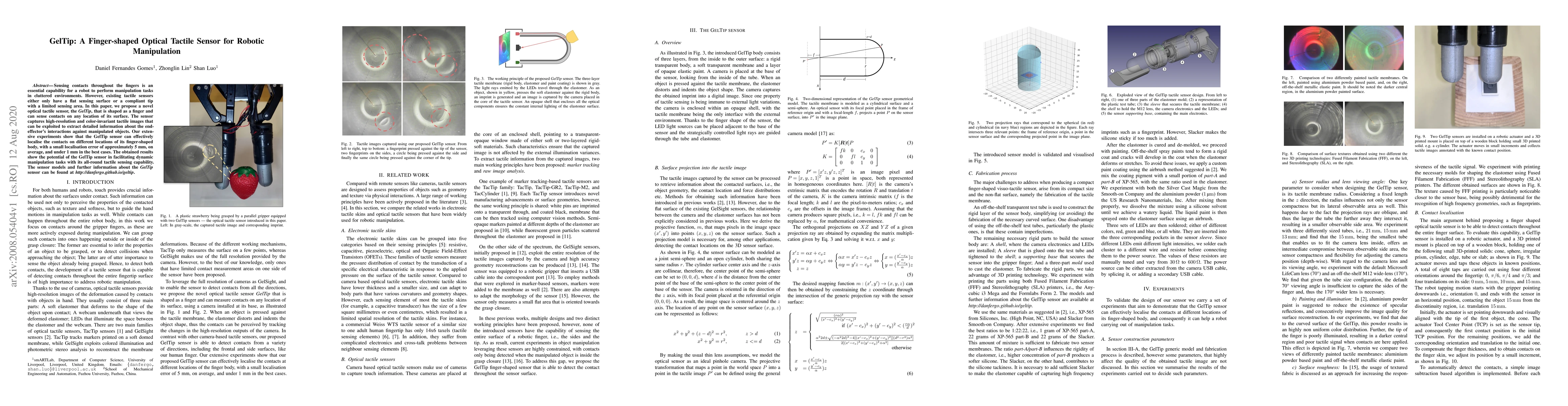 The GelTip sensor is a finger-shaped optical tactile sensor designed to provide comprehensive contact sensing across its entire surface, enabling robots to perform manipulation tasks in cluttered environments. Experiments demonstrate its high-resolution, color-invariant tactile imaging and precise contact localization, with an average error of 5 mm.