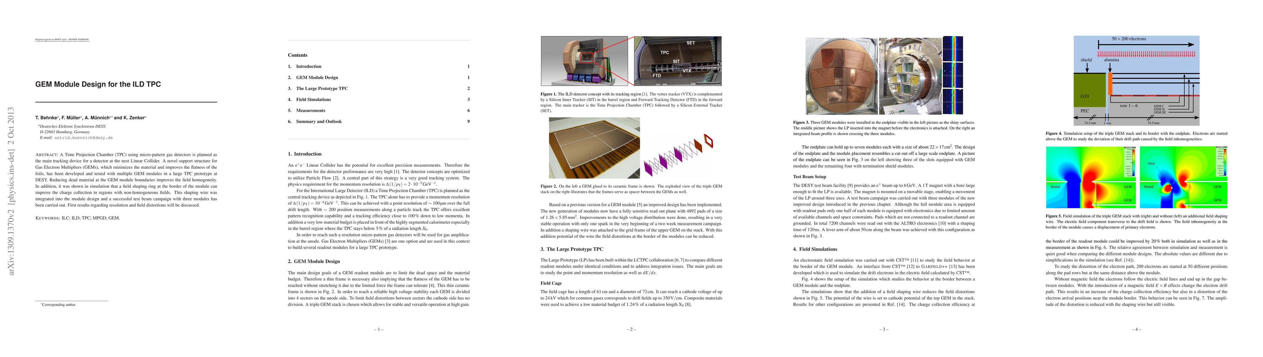 This paper details the development of a novel GEM module support structure for a TPC in the ILD detector, aiming to minimize material and improve foil flatness. The new design includes a field shaping ring to enhance charge collection, which was successfully tested in a prototype and a test beam campaign, showing promising results for resolution and field distortions.