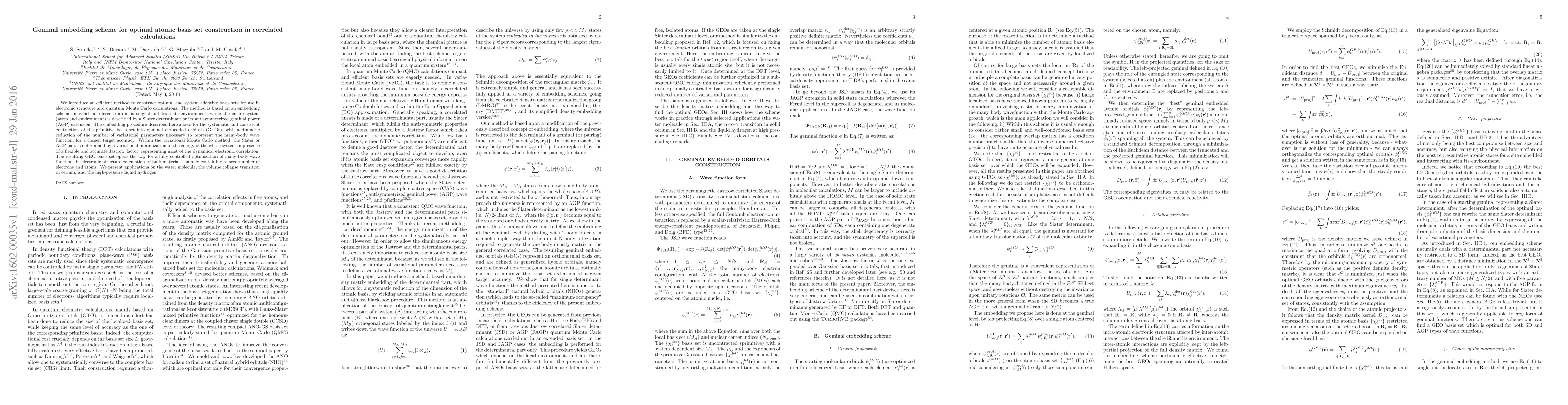 We introduce an efficient method to construct optimal and system adaptive basis sets for use in electronic structure and quantum Monte Carlo calculations. The method is based on an embedding scheme in which a reference atom is singled out from its environment, while the entire system (atom and environment) is described by a Slater determinant or its antisymmetrized geminal power (AGP) extension. The embedding procedure described here allows for the systematic and consistent contraction of the primitive basis set into geminal embedded orbitals (GEOs), with a dramatic reduction of the number of variational parameters necessary to represent the many-body wave function, for a chosen target accuracy. Within the variational Monte Carlo method, the Slater or AGP part is determined by a variational minimization of the energy of the whole system in presence of a flexible and accurate Jastrow factor, representing most of the dynamical electronic correlation. The resulting GEO basis set opens the way for a fully controlled optimization of many-body wave functions in electronic structure calculation of bulk materials, namely, containing a large number of electrons and atoms. We present applications on the water molecule, the volume collapse transition in cerium, and the high-pressure liquid hydrogen.