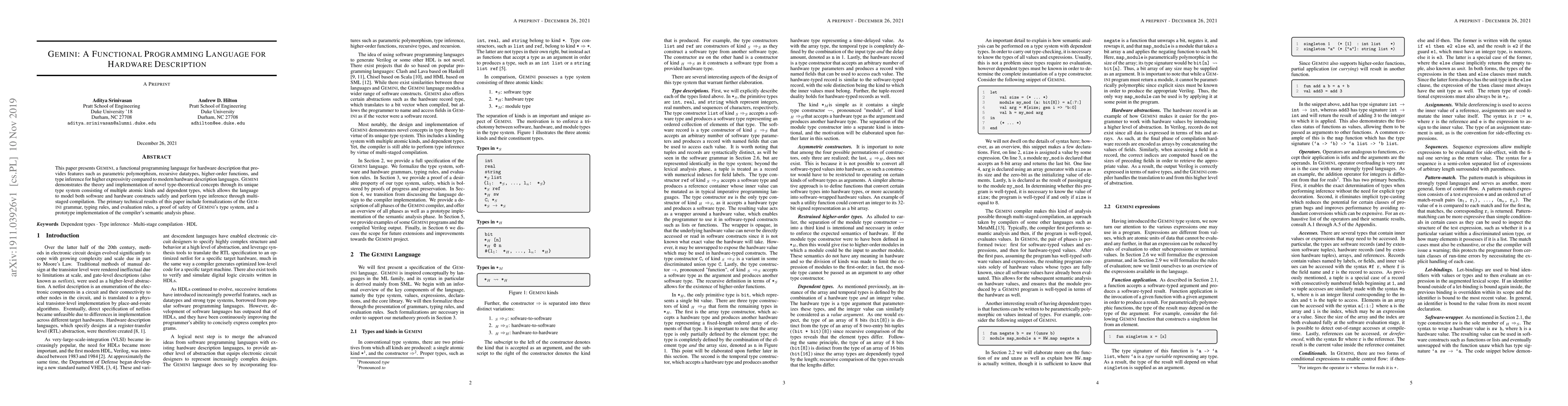 Gemini is a functional programming language for hardware description that offers advanced features like parametric polymorphism and type inference. It employs a novel type system with multiple kinds and dependent types for safe modeling of both software and hardware constructs, supported by a prototype compiler implementation.