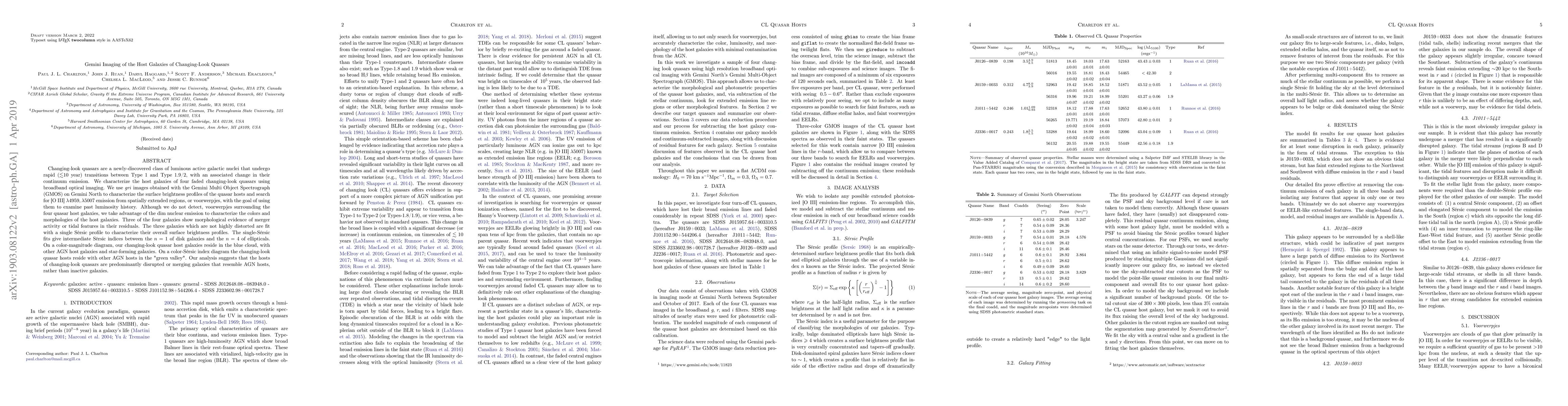 Changing-look quasars are a newly-discovered class of luminous active galactic nuclei that undergo rapid ($\lesssim$10 year) transitions between Type 1 and Type 1.9/2, with an associated change in their continuum emission. We characterize the host galaxies of four faded changing-look quasars using broadband optical imaging. We use \textit{gri} images obtained with the Gemini Multi Object Spectrograph (GMOS) on Gemini North to characterize the surface brightness profiles of the quasar hosts and search for [O III] $\lambda4959,\lambda5007$ emission from spatially extended regions, or voorwerpjes, with the goal of using them to examine past luminosity history. Although we do not detect, voorwerpjes surrounding the four quasar host galaxies, we take advantage of the dim nuclear emission to characterize the colors and morphologies of the host galaxies. Three of the four galaxies show morphological evidence of merger activity or tidal features in their residuals. The three galaxies which are not highly distorted are fit with a single S\'ersic profile to characterize their overall surface brightness profiles. The single-S\'ersic fits give intermediate S\'ersic indices between the $n=1$ of disk galaxies and the $n=4$ of ellipticals. On a color-magnitude diagram, our changing-look quasar host galaxies reside in the blue cloud, with other AGN host galaxies and star-forming galaxies. On a color-S\'ersic index diagram the changing-look quasar hosts reside with other AGN hosts in the "green valley". Our analysis suggests that the hosts of changing-look quasars are predominantly disrupted or merging galaxies that resemble AGN hosts, rather than inactive galaxies.