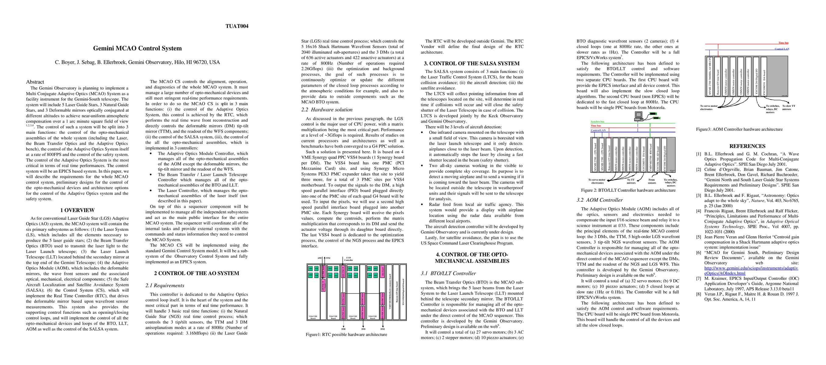 A Gemini Observatory MCAO system will utilize 5 laser guide stars, 3 natural guide stars, and deformable mirrors to achieve near-uniform atmospheric compensation. The control system for the system consists of three main functions: opto-mechanical assembly control, Adaptive Optics System control, and safety system control.