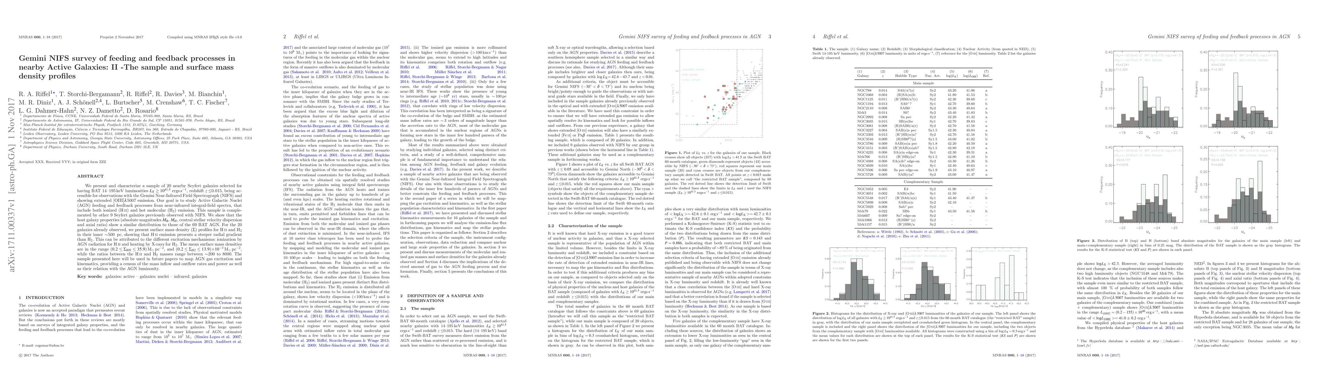 We present and characterize a sample of 20 nearby Seyfert galaxies selected for having BAT 14--195keV luminosities $L_X \ge 10^{41.5}$ erg s$^{-1}$, redshift $z\le$0.015, being accessible for observations with the Gemini Near-Infrared Field Spectrograph (NIFS) and showing extended [OIII]$\lambda$5007 emission. Our goal is to study Active Galactic Nuclei (AGN) feeding and feedback processes from near-infrared integral-field spectra, that include both ionized (HII) and hot molecular (H$_2$) emission. This sample is complemented by other 9 Seyfert galaxies previously observed with NIFS. We show that the host galaxy properties (absolute magnitudes $M_B$, $M_H$, central stellar velocity dispersion and axial ratio) show a similar distribution to those of the 69 BAT AGN. For the 20 galaxies already observed, we present surface mass density ($\Sigma$) profiles for HII and H$_2$ in their inner $\sim$500 pc, showing that HII emission presents a steeper radial gradient than H$_2$. This can be attributed to the different excitation mechanisms: ionization by AGN radiation for HII and heating by X-rays for H$_2$. The mean surface mass densities are in the range ($0.2\le \Sigma_{HII} \le 35.9$)M$_\odot$pc$^{-2}$, and ($0.2\le \Sigma_{H2} \le 13.9$)$\times10^{-3}$M$_\odot$pc$^{-2}$, while the ratios between the HII and H$_2$ masses range between $\sim$200 to 8000. The sample presented here will be used in future papers to map AGN gas excitation and kinematics, providing a census of the mass inflow and outflow rates and power as well as their relation with the AGN luminosity.