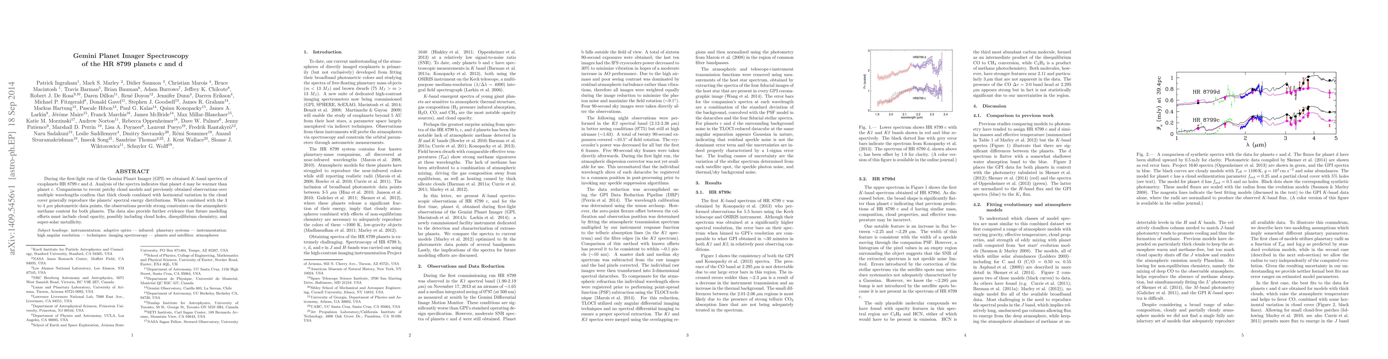 The Gemini Planet Imager (GPI) obtained K-band spectra of exoplanets HR 8799 c and d, suggesting planet d may be warmer than planet c. The analysis indicates that thick clouds and horizontal cloud cover variations are key factors in reproducing the planets' spectral energy distributions.