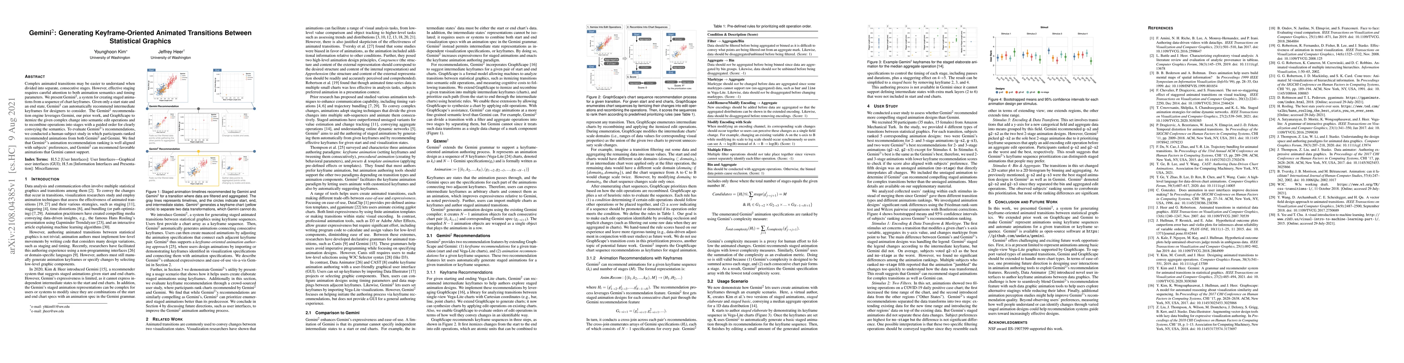 Gemini2 automates the creation of staged animated transitions between statistical graphics by recommending keyframes based on semantic edit operations and timing parameters. A human-subject study shows that Gemini2's recommendations align well with user preferences, offering superior animations compared to its predecessor, Gemini.