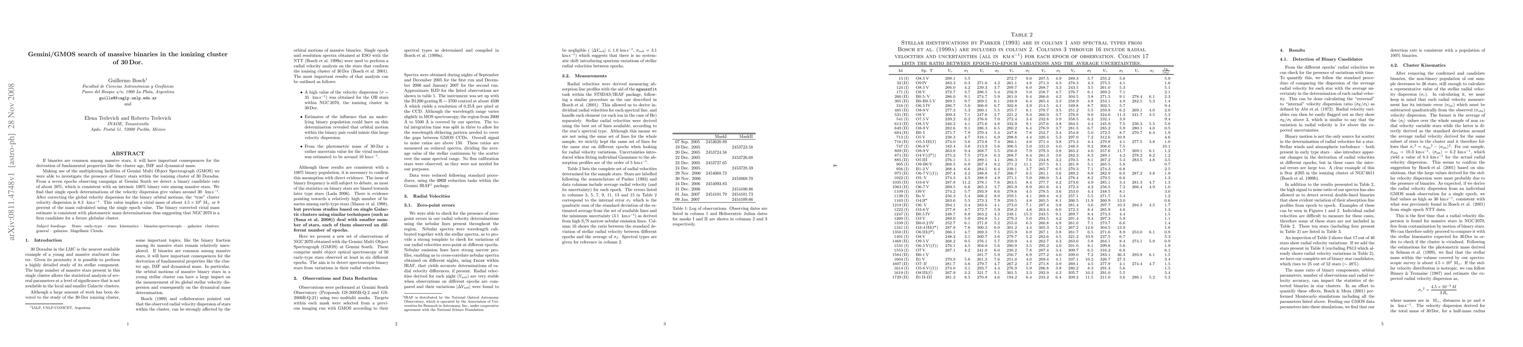 If binaries are common among massive stars, it will have important consequences for the derivation of fundamental properties like the cluster age, IMF and dynamical mass. Making use of the multiplexing facilities of Gemini Multi Object Spectrograph (GMOS) we were able to investigate the presence of binary stars within the ionising cluster of 30 Doradus. From a seven epochs observing campaign at Gemini South we detect a binary candidate rate of about 50%, which is consistent with an intrinsic 100% binary rate among massive stars. We find that single epoch determinations of the velocity dispersion give values around 30 km/s . After correcting the global velocity dispersion for the binary orbital motions, the true cluster velocity dispersion is 8.3 km/s. This value implies a virial mass of about 4.5E5 Msun or 8 percent of the mass calculated using the single epoch value. The binary corrected virial mass estimate is consistent with photometric mass determinations thus suggesting that NGC 2070 is a firm candidate for a future globular cluster.