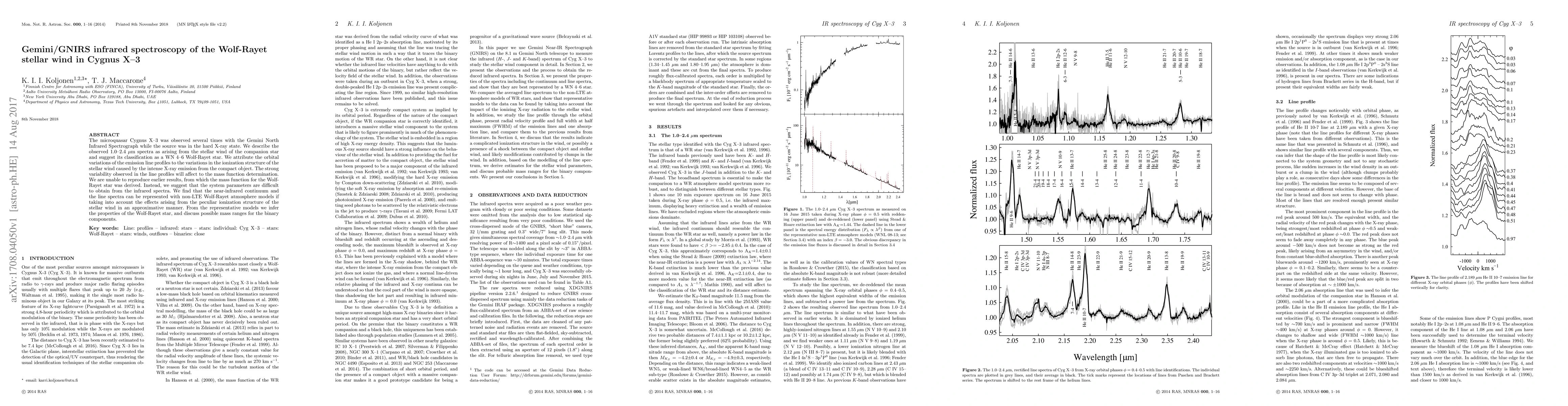 This paper analyzes the infrared spectra of Cygnus X-3's Wolf-Rayet star companion, classifying it as WN 4-6, and attributes orbital variations in emission lines to changes in the stellar wind's ionization structure due to the X-ray emission from the compact object. The study finds that the system's parameters are difficult to obtain from the infrared spectra, leading to discrepancies with earlier mass function determinations.