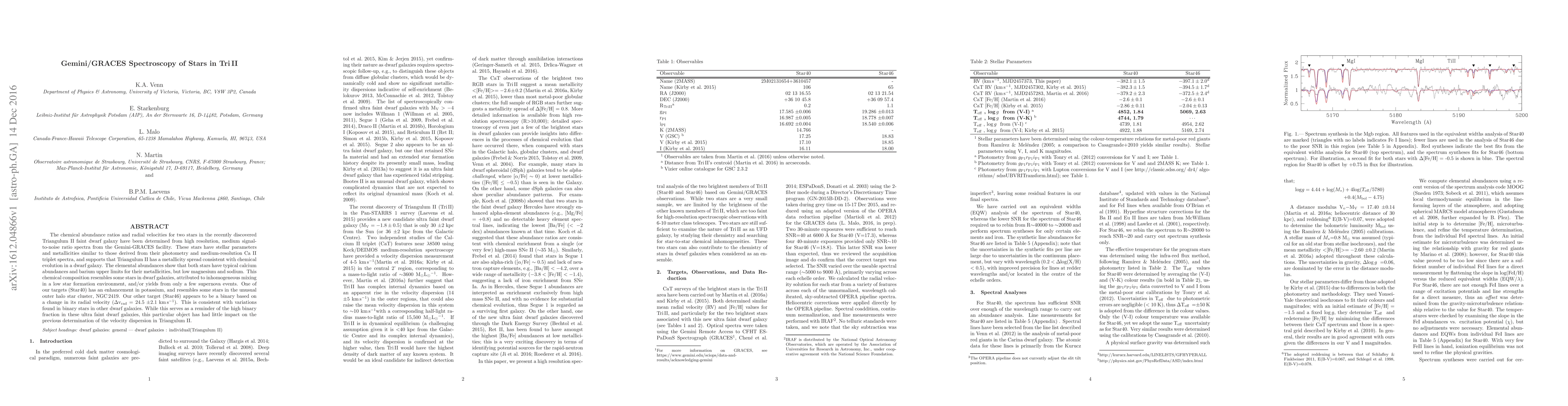Researchers analyzed two stars in Triangulum II using Gemini-GRACES spectroscopy to find that they have typical calcium abundances and low magnesium and sodium levels, similar to other dwarf galaxies. The study also identified a potential binary star system within the galaxy.