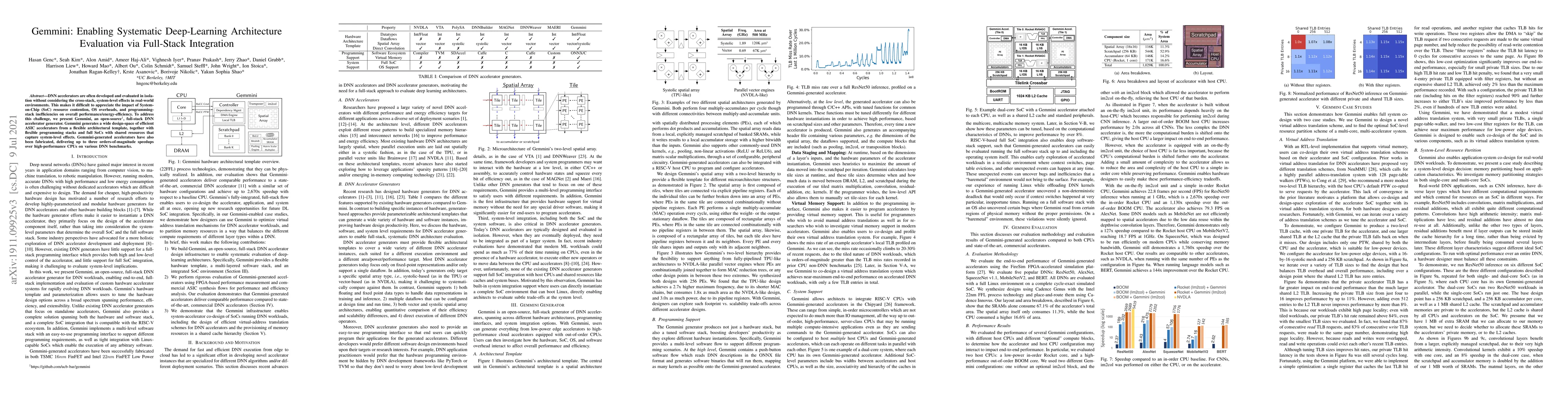 Title: Gemmini: Enabling Systematic Deep-Learning Architecture Evaluation via Full-Stack Integration Summary: Gemmini is an open-source DNN accelerator generator that facilitates comprehensive evaluation of deep-learning architectures by integrating full-stack solutions, including ASIC accelerators, programming stacks, and SoCs, to capture system-level effects and achieve significant performance improvements.