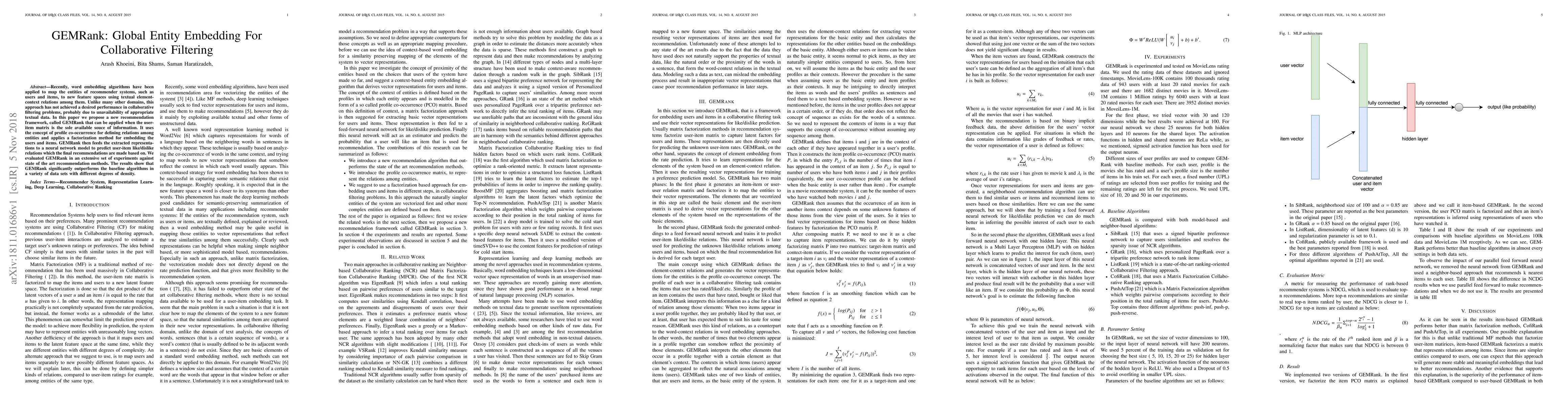 Recently, word embedding algorithms have been applied to map the entities of recommender systems, such as users and items, to new feature spaces using textual element-context relations among them. Unlike many other domains, this approach has not achieved a desired performance in collaborative filtering problems, probably due to unavailability of appropriate textual data. In this paper we propose a new recommendation framework, called GEMRank that can be applied when the user-item matrix is the sole available souce of information. It uses the concept of profile co-occurrence for defining relations among entities and applies a factorization method for embedding the users and items. GEMRank then feeds the extracted representations to a neural network model to predict user-item like/dislike relations which the final recommendations are made based on. We evaluated GEMRank in an extensive set of experiments against state of the art recommendation methods. The results show that GEMRank significantly outperforms the baseline algorithms in a variety of data sets with different degrees of density.