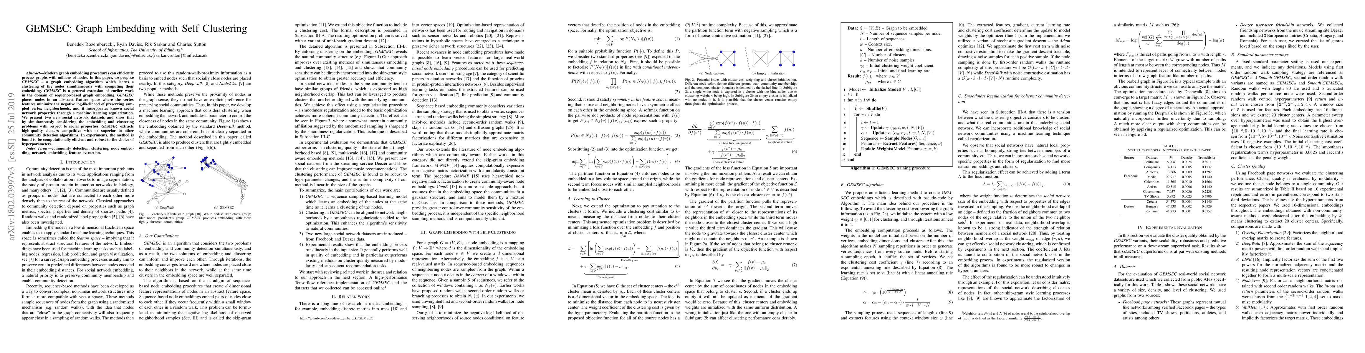 GEMSEC is a novel graph embedding algorithm that integrates node clustering during embedding, achieving competitive clustering results and demonstrating computational efficiency. It leverages machine learning regularization to incorporate social network properties and outperforms other community detection algorithms.