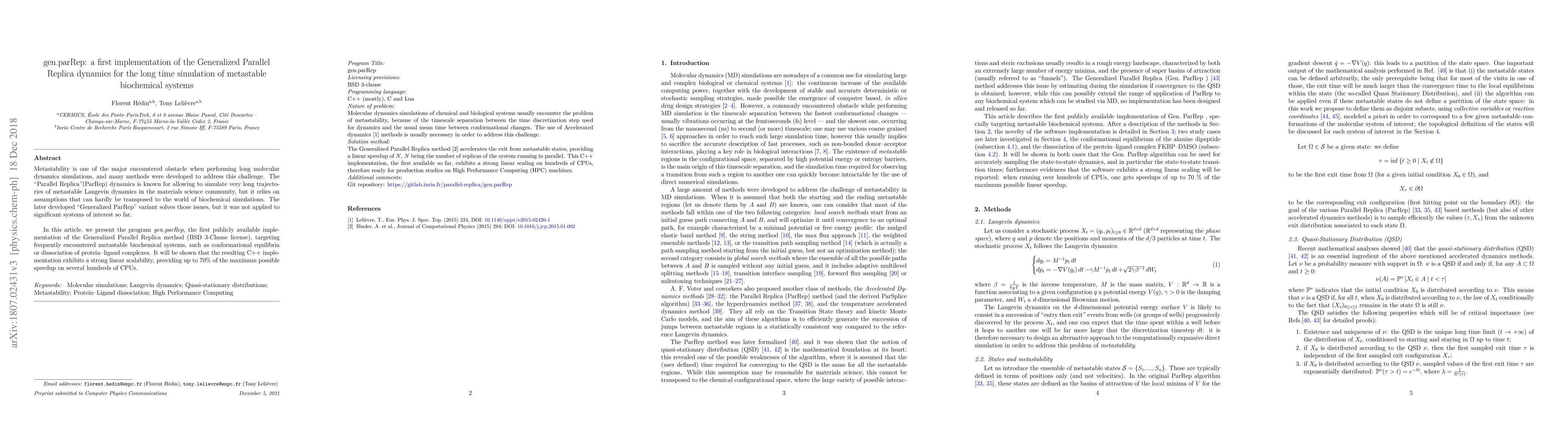 Metastability is one of the major encountered obstacle when performing long molecular dynamics simulations, and many methods were developed to address this challenge. The "Parallel Replica" (ParRep) dynamics is known for allowing to simulate very long trajectories of metastable Langevin dynamics in the materials science community, but it relies on assumptions that can hardly be transposed to the world of biochemical simulations. The later developed "Generalized ParRep" variant solves those issues, but it was not applied to significant systems of interest so far. In this article, we present the program gen.parRep, the first publicly available implementation of the Generalized Parallel Replica method (BSD 3-Clause license), targeting frequently encountered metastable biochemical systems, such as conformational equilibria or dissociation of protein-ligand complexes. It will be shown that the resulting C++ implementation exhibits a strong linear scalability, providing up to 70 % of the maximum possible speedup on several hundreds of CPUs.
