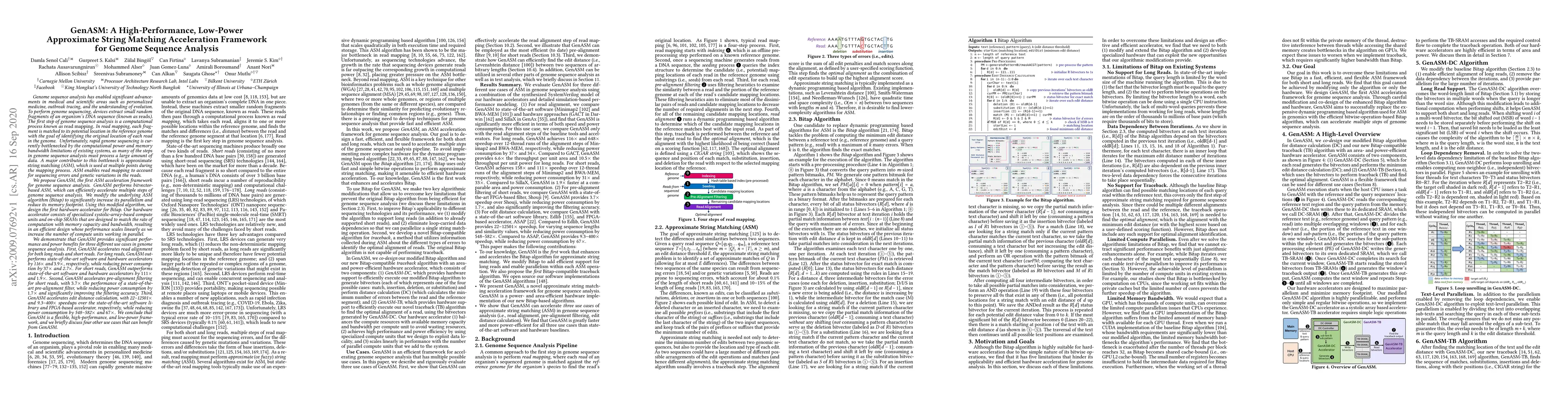 GenASM is a high-performance, low-power framework designed to accelerate approximate string matching for genome sequence analysis, addressing computational bottlenecks. It significantly enhances the Bitap algorithm and includes a specialized hardware accelerator, achieving substantial speedups and power reductions across various genome sequence analysis tasks.