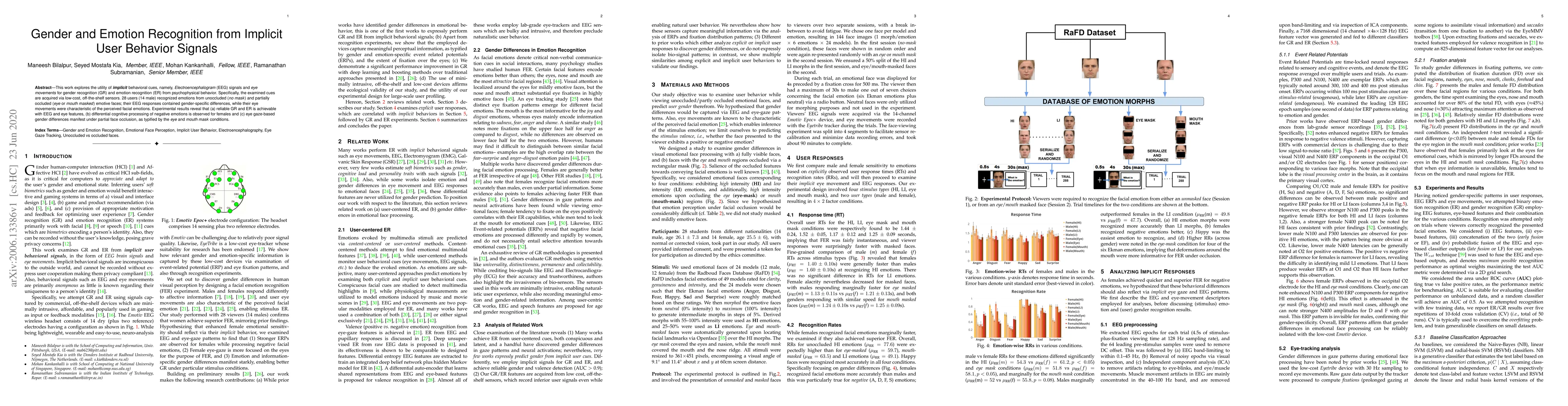 This work explores the utility of implicit behavioral cues, namely, Electroencephalogram (EEG) signals and eye movements for gender recognition (GR) and emotion recognition (ER) from psychophysical behavior. Specifically, the examined cues are acquired via low-cost, off-the-shelf sensors. 28 users (14 male) recognized emotions from unoccluded (no mask) and partially occluded (eye or mouth masked) emotive faces; their EEG responses contained gender-specific differences, while their eye movements were characteristic of the perceived facial emotions. Experimental results reveal that (a) reliable GR and ER is achievable with EEG and eye features, (b) differential cognitive processing of negative emotions is observed for females and (c) eye gaze-based gender differences manifest under partial face occlusion, as typified by the eye and mouth mask conditions.