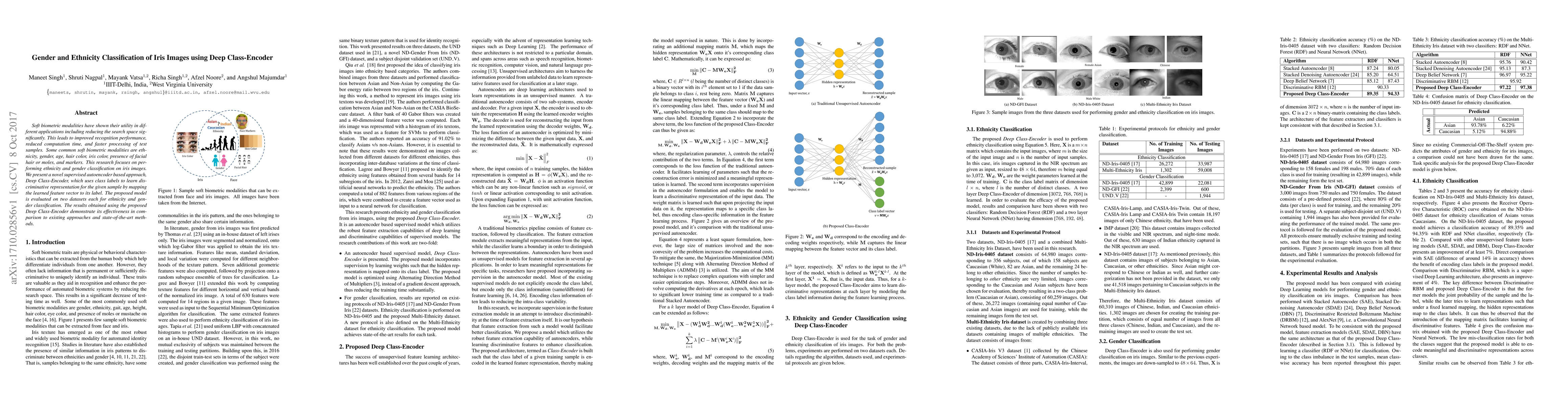 This research proposes a Deep Class-Encoder, a supervised autoencoder model, for classifying ethnicity and gender from iris images, showing improved performance over existing methods. The model effectively learns discriminative representations using class labels to map features to labels, validated on two separate datasets.