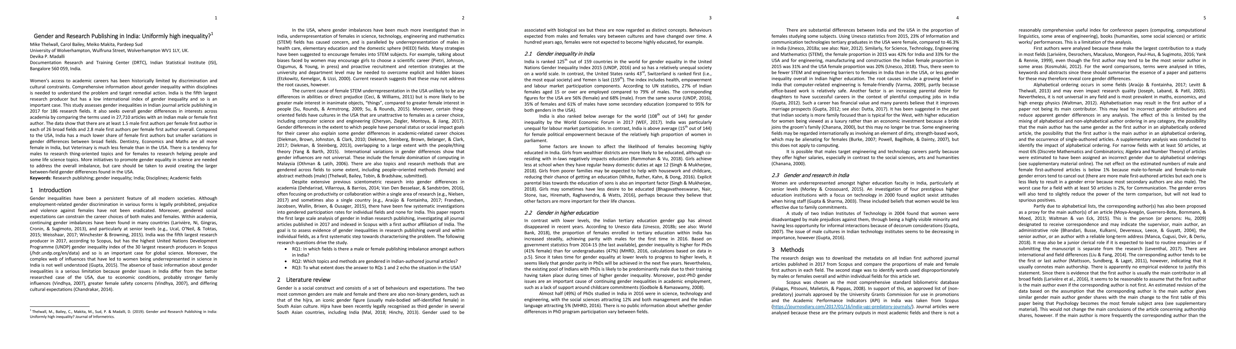 This study reveals significant gender inequality in Indian academic publishing, with a ratio of 1.5 to 2.8 male first authors per female across various fields, highlighting a need for initiatives to promote gender equality in science while avoiding larger between-field disparities seen in the USA.