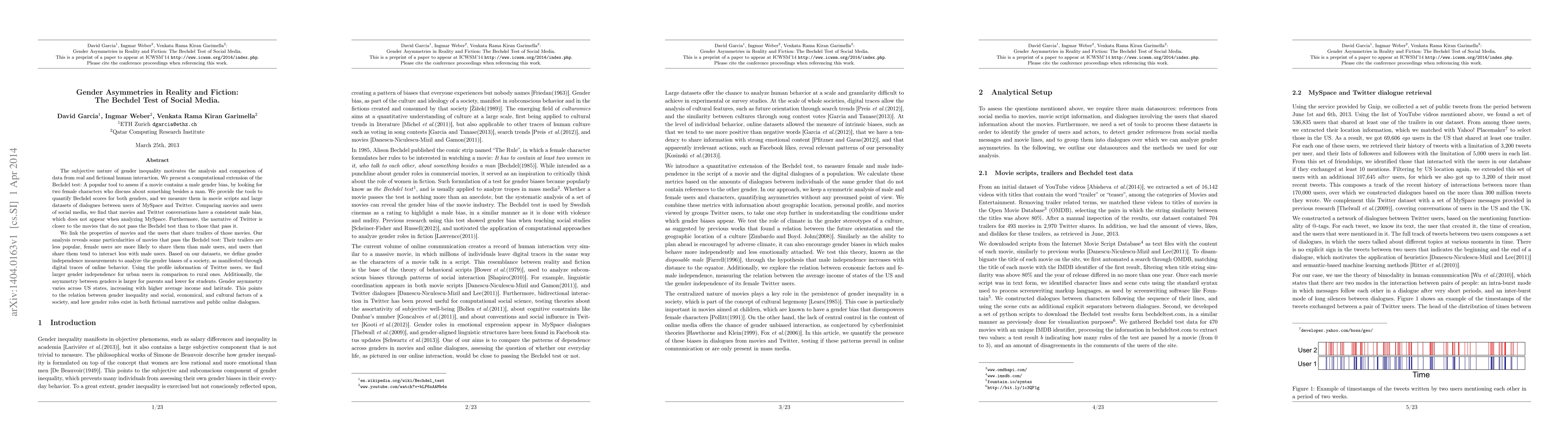 The subjective nature of gender inequality motivates the analysis and comparison of data from real and fictional human interaction. We present a computational extension of the Bechdel test: A popular tool to assess if a movie contains a male gender bias, by looking for two female characters who discuss about something besides a man. We provide the tools to quantify Bechdel scores for both genders, and we measure them in movie scripts and large datasets of dialogues between users of MySpace and Twitter. Comparing movies and users of social media, we find that movies and Twitter conversations have a consistent male bias, which does not appear when analyzing MySpace. Furthermore, the narrative of Twitter is closer to the movies that do not pass the Bechdel test than to those that pass it. We link the properties of movies and the users that share trailers of those movies. Our analysis reveals some particularities of movies that pass the Bechdel test: Their trailers are less popular, female users are more likely to share them than male users, and users that share them tend to interact less with male users. Based on our datasets, we define gender independence measurements to analyze the gender biases of a society, as manifested through digital traces of online behavior. Using the profile information of Twitter users, we find larger gender independence for urban users in comparison to rural ones. Additionally, the asymmetry between genders is larger for parents and lower for students. Gender asymmetry varies across US states, increasing with higher average income and latitude. This points to the relation between gender inequality and social, economical, and cultural factors of a society, and how gender roles exist in both fictional narratives and public online dialogues.