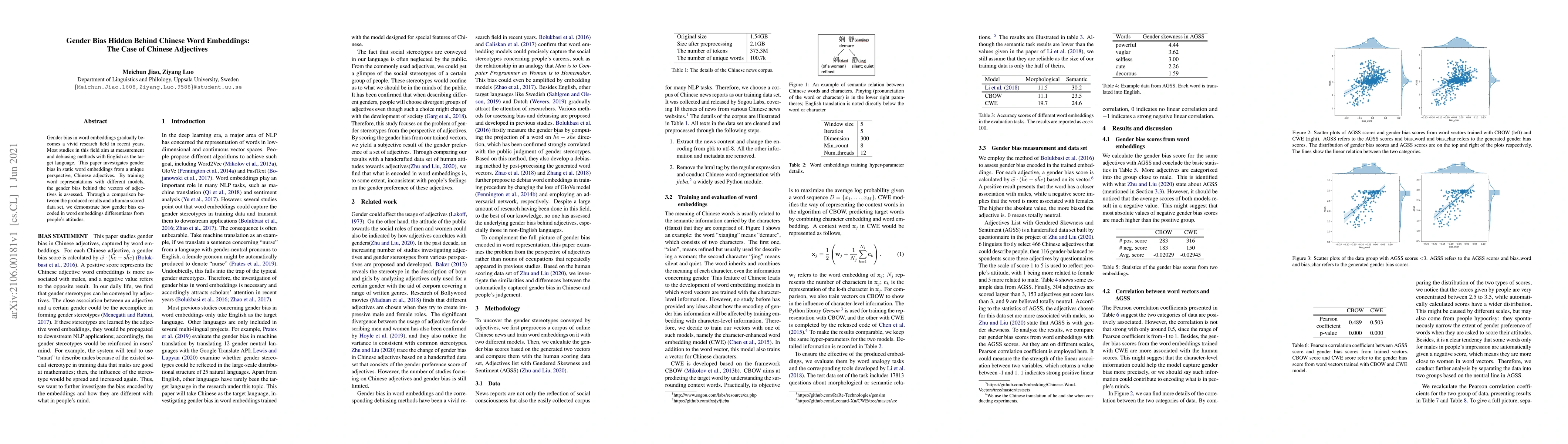 This paper examines gender bias in Chinese word embeddings, focusing on adjectives, and compares model-generated results with human-assessed data to reveal discrepancies between encoded biases and human attitudes.