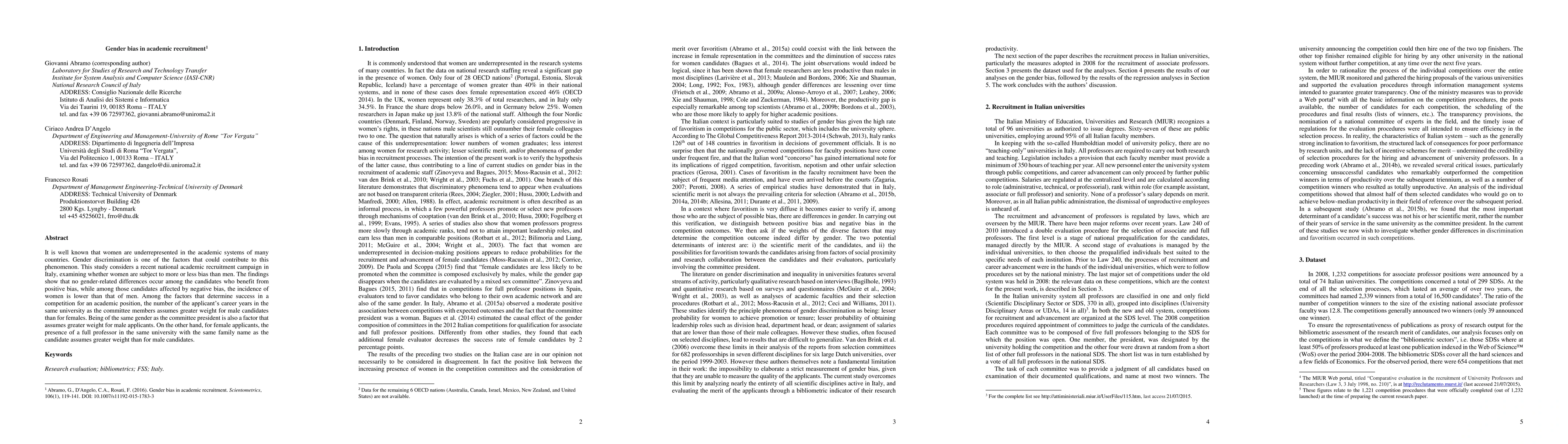 It is well known that women are underrepresented in the academic systems of many countries. Gender discrimination is one of the factors that could contribute to this phenomenon. This study considers a recent national academic recruitment campaign in Italy, examining whether women are subject to more or less bias than men. The findings show that no gender-related differences occur among the candidates who benefit from positive bias, while among those candidates affected by negative bias, the incidence of women is lower than that of men. Among the factors that determine success in a competition for an academic position, the number of the applicant's career years in the same university as the committee members assumes greater weight for male candidates than for females. Being of the same gender as the committee president is also a factor that assumes greater weight for male applicants. On the other hand, for female applicants, the presence of a full professor in the same university with the same family name as the candidate assumes greater weight than for male candidates.