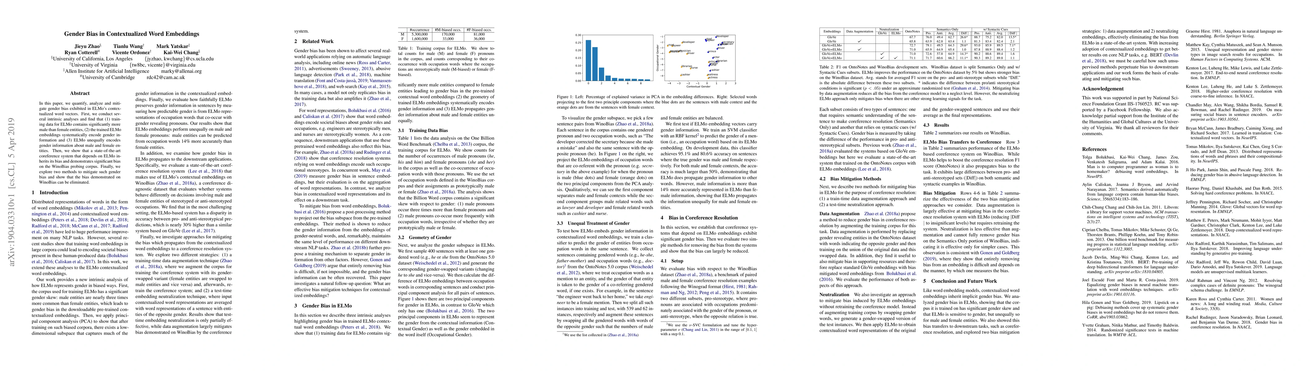 This paper quantifies and analyzes gender bias in ELMo's contextualized word embeddings, finding significant male-female imbalance and systematic gender encoding. It also demonstrates that a coreference system relying on ELMo inherits this bias, and proposes methods to mitigate it, successfully eliminating the bias on the WinoBias corpus.