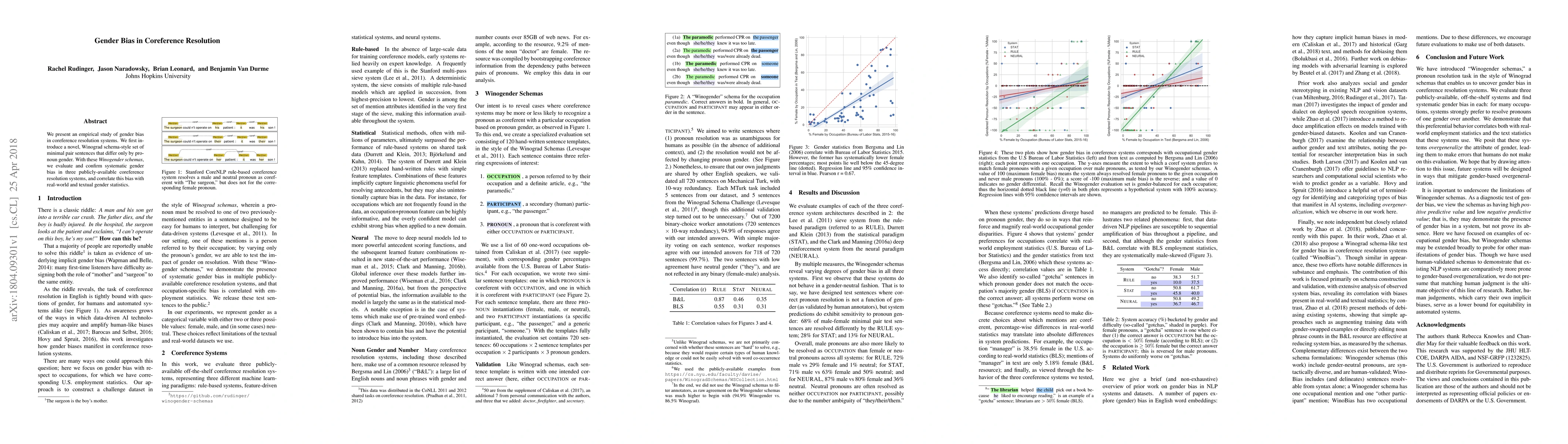 This study investigates gender bias in coreference resolution systems using a novel set of Winogender schemas, confirming systematic gender bias in three publicly-available systems and correlating it with real-world and textual gender statistics. The findings highlight the need for bias mitigation in natural language processing tools.